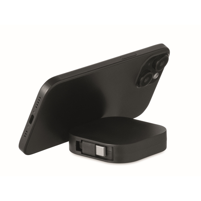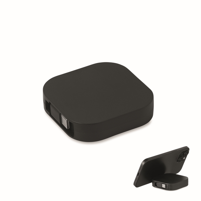 Zatahovací 100W nabíjecí a datový kabel. S funkcí držáku telefonu. Kabel z PVC v pouzdru z ABS. Přenos dat 480 Mb/s. Konektor Type-C na Type-C. Rozměry: 6.4 x 6.4 x 1.4 cm