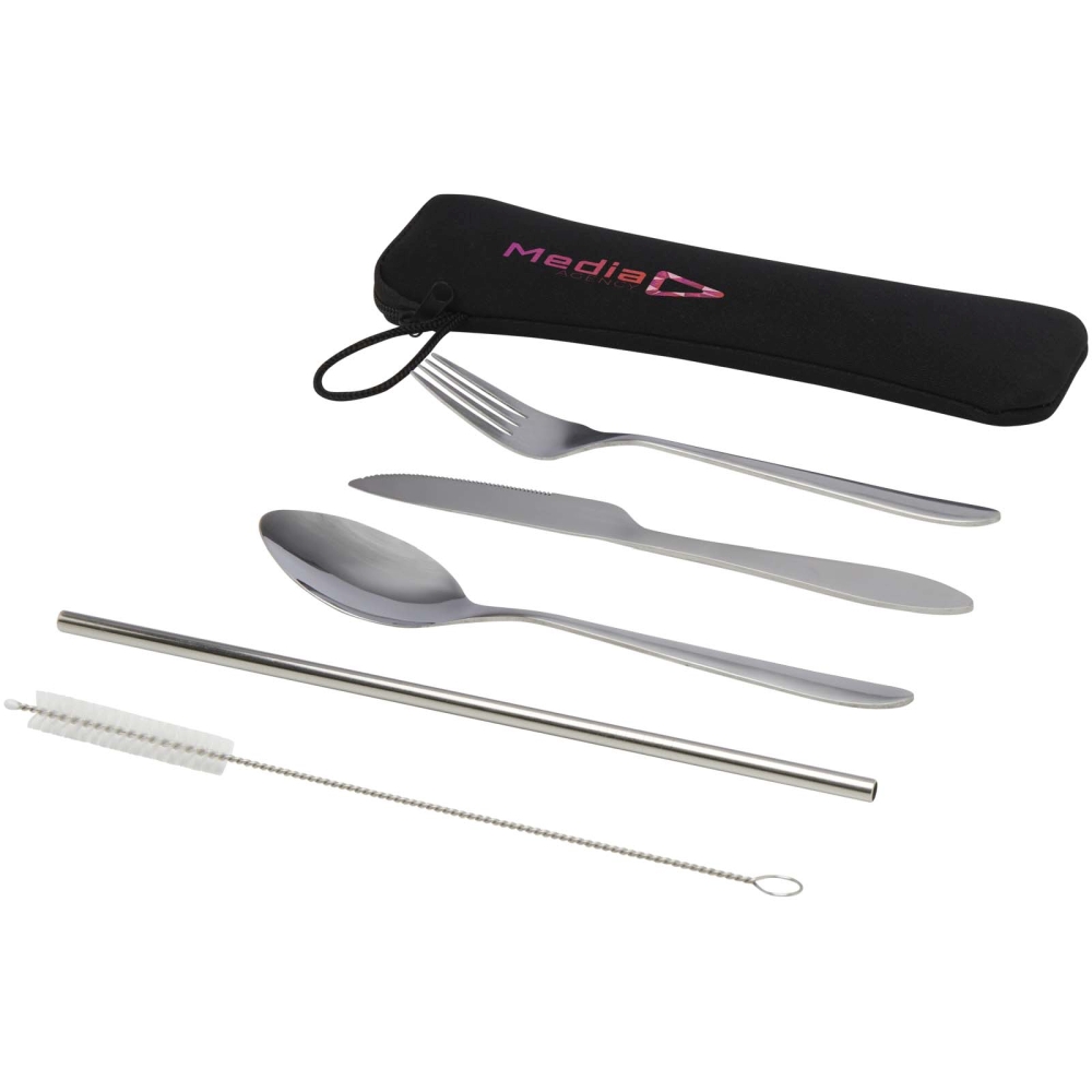 Sada příborů obsahující vidličku, nůž, lžíci, brčko a čisticí kartáč. Příbory jsou vyrobeny z nerezové oceli, která je odolná a snadno se čistí. Dodáváno v polyesterovém sáčku na zip s praktickým poutkem na přenášení. Rozměry: 21,5 x 6,5 cm
