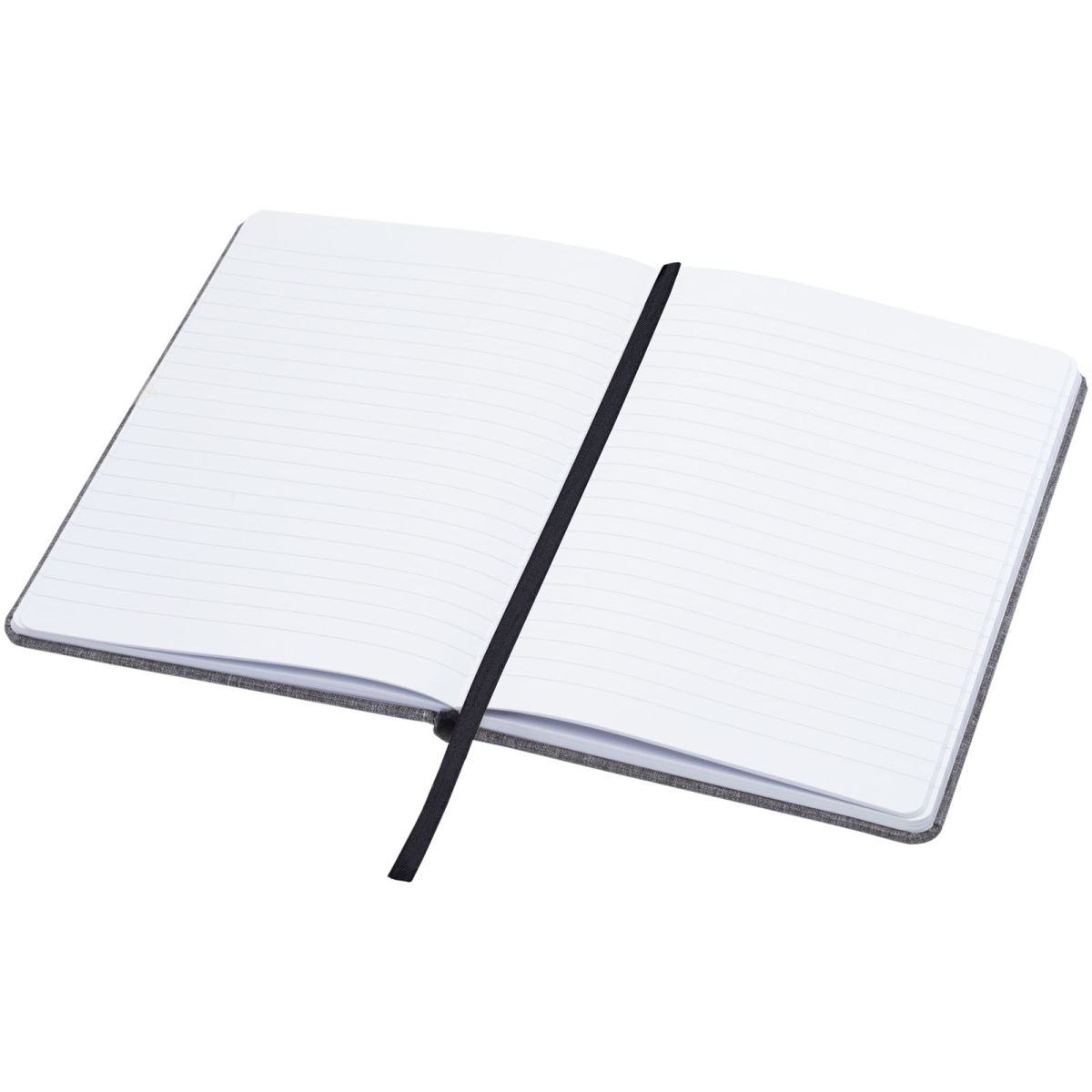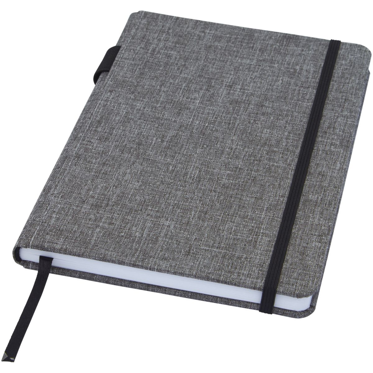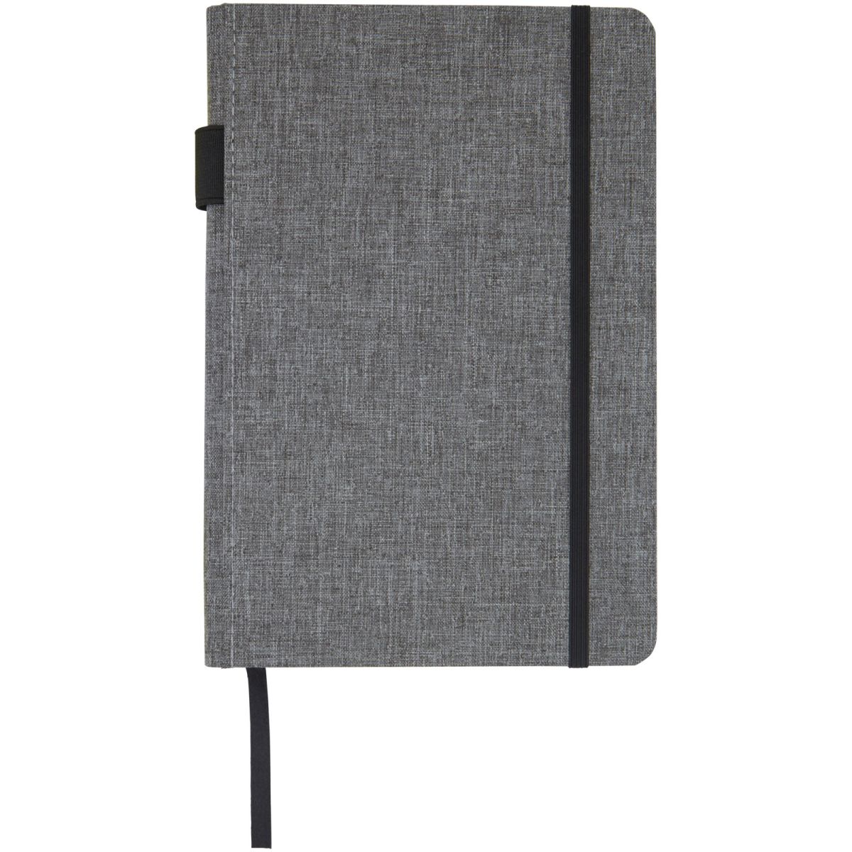 Poznámkový blok velikosti A5 s obálkou z RPET tkaniny. Obsahuje 96 listů linkovaného recyklovaného papíru 70 g/m2 se stuhovou záložkou a poutkem na pero. Lepenkový obal. Rozměry: 21,5 x 14,5 cm.