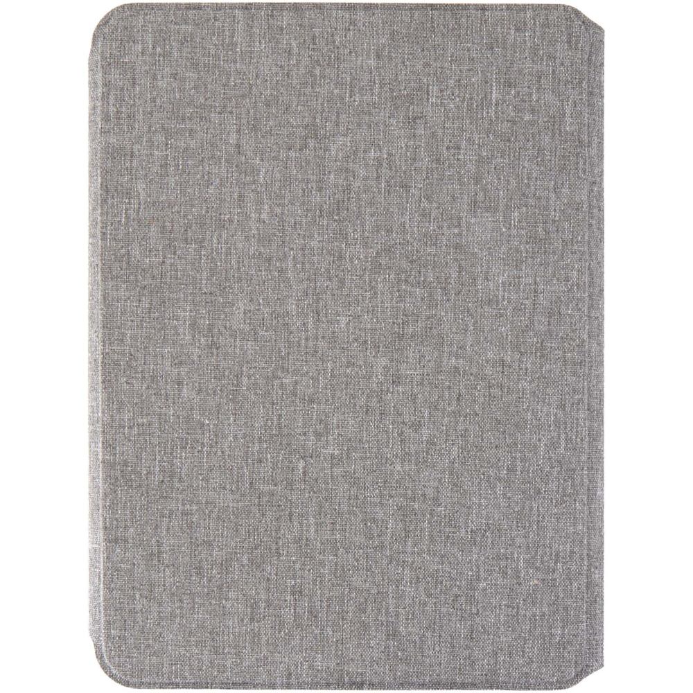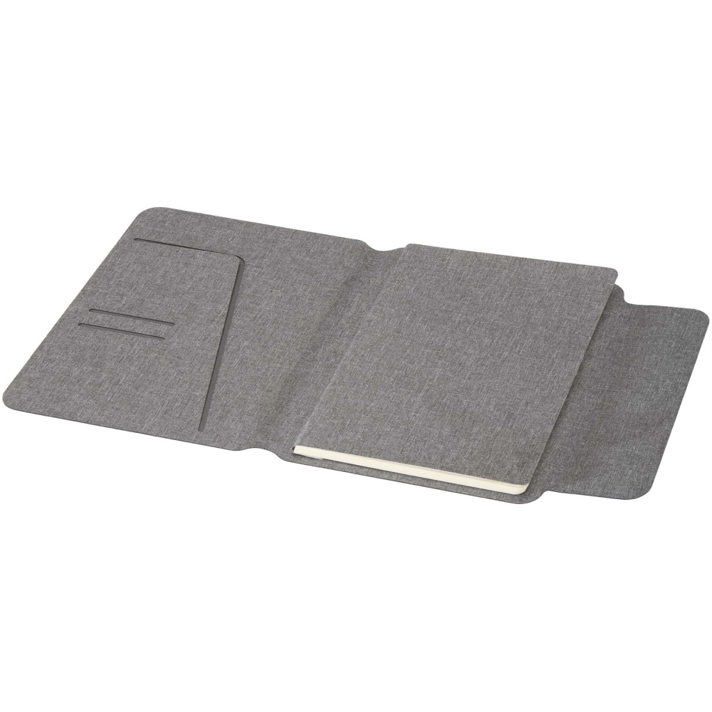 Portfolio velikosti A5 je částečně vyrobeno z recyklovaného polyesteru s certifikací RCS, což nabízí udržitelnější alternativu snížením závislosti na primárních materiálech. Mají elegantní šedou pevnou vazbu se zaoblenými rohy a precizně svařovanou technologii a jsou zajištěny magnetickým uzávěrem, který je zvýrazněn detailem z ořechového dřeva, což dodává moderní a sofistikovaný nádech. Uvnitř najdete odnímatelný zápisník s měkkou vazbou a 64 linkovanými listy papíru krémové barvy s gramáží 80 g/m2, který je vyroben ze zodpovědných zdrojů. Dodáváno v obalu z kraftového papíru. Rozměry: 20 x 17 cm