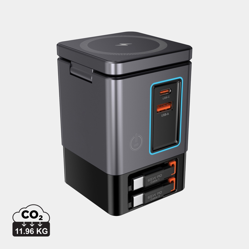 105W nabíječka, která kombinuje maximální výkon s komfortem. Nabízí dva vestavěné zasouvací USB-C kabely s výkonem 65 W, takže máte rychlé nabíjení vždy po ruce – bez potřeby dalších kabelů. Kromě toho je vybavena USB-A a dalším USB-C portem, což dohromady poskytuje čtyři výstupy pro současné nabíjení notebooků, tabletů, chytrých telefonů a dalších zařízení. Pro bezdrátová zařízení disponuje výkonnou 15W magnetickou bezdrátovou nabíječkou, která pevně drží telefon, a samostatnou bezdrátovou podložkou (5W) určenou pro sluchátka nebo AirPods. Díky moderní GaN technologii je kompaktní, efektivní, produkuje méně tepla a spotřebovává méně energie než běžné nabíječky. Vyrobeno z ohnivzdorného recyklovaného PC plastu.Rozměry: 6.5 x 6.5 x 10 cm