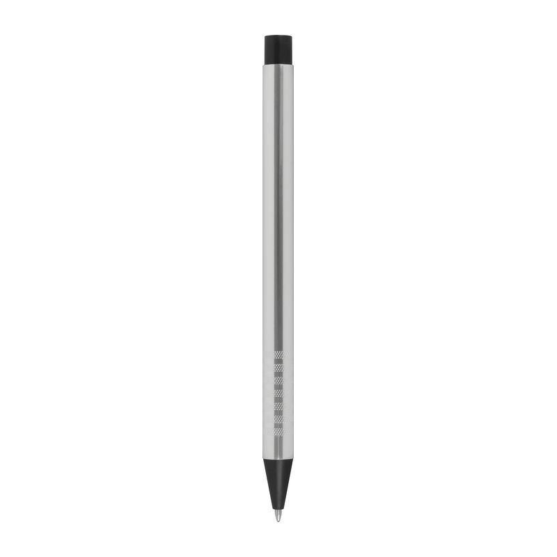 Kovové kuličkové pero s modrou náplní, jehož tělo je vyrobeno v moderním nadčasovém designu. Rozměry: o 0,9 x 15 cm.