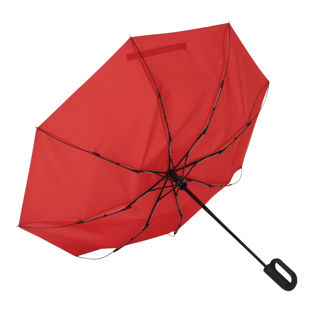 Automatický větruodolný kapesní deštník s pouzdrem. Třídílná kovová tyč s kovovými/sklolaminátovými žebry a kovovými koncovkami, pogumovaná karabina, stříška z polyesterové pongee z recyklovaného plastu, zapínání na suchý zip. Rozměry: O98 / 33-60 cm