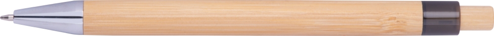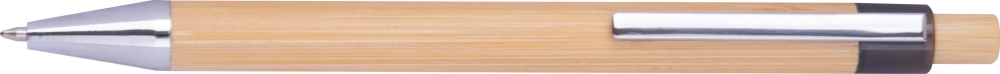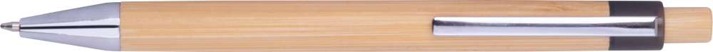 Bambusová propiska s modrou náplní a chromovanými doplňky. Rozměry: o 1,1 x 14,2 cm