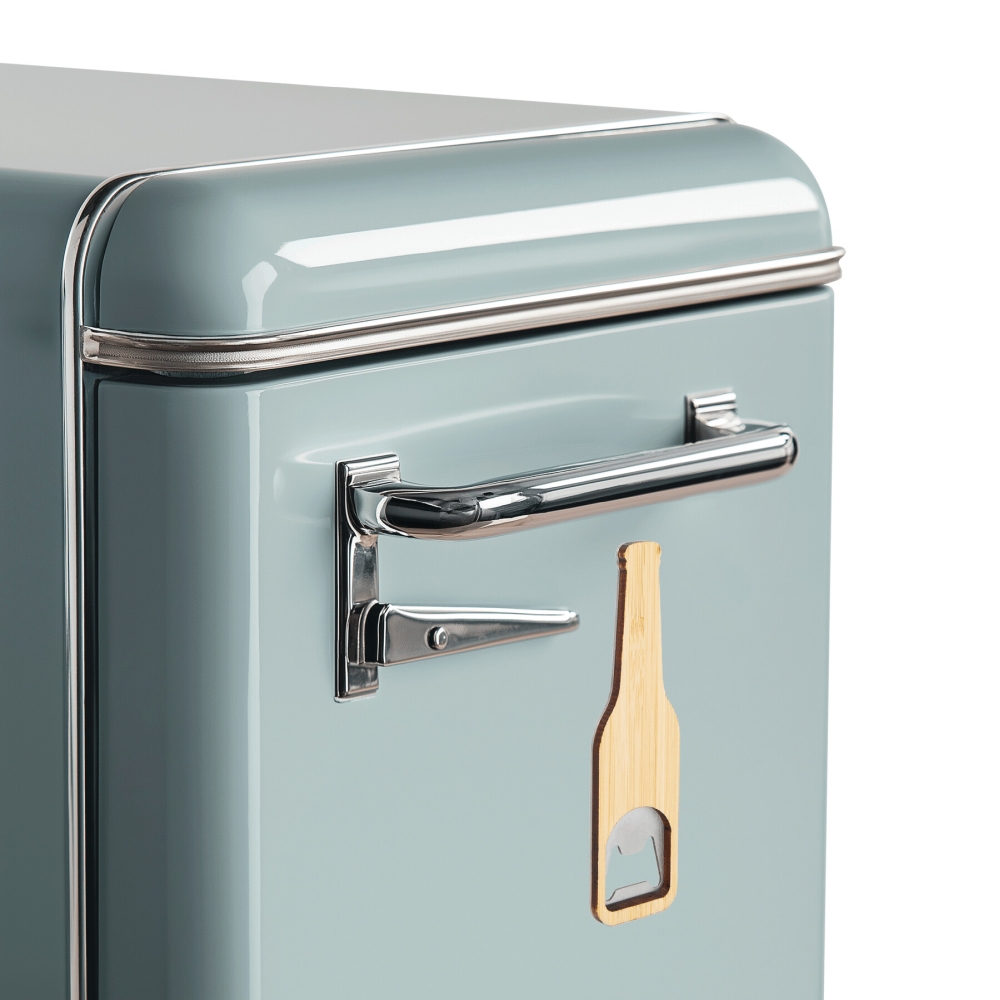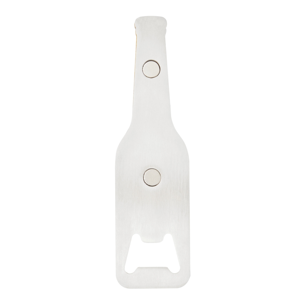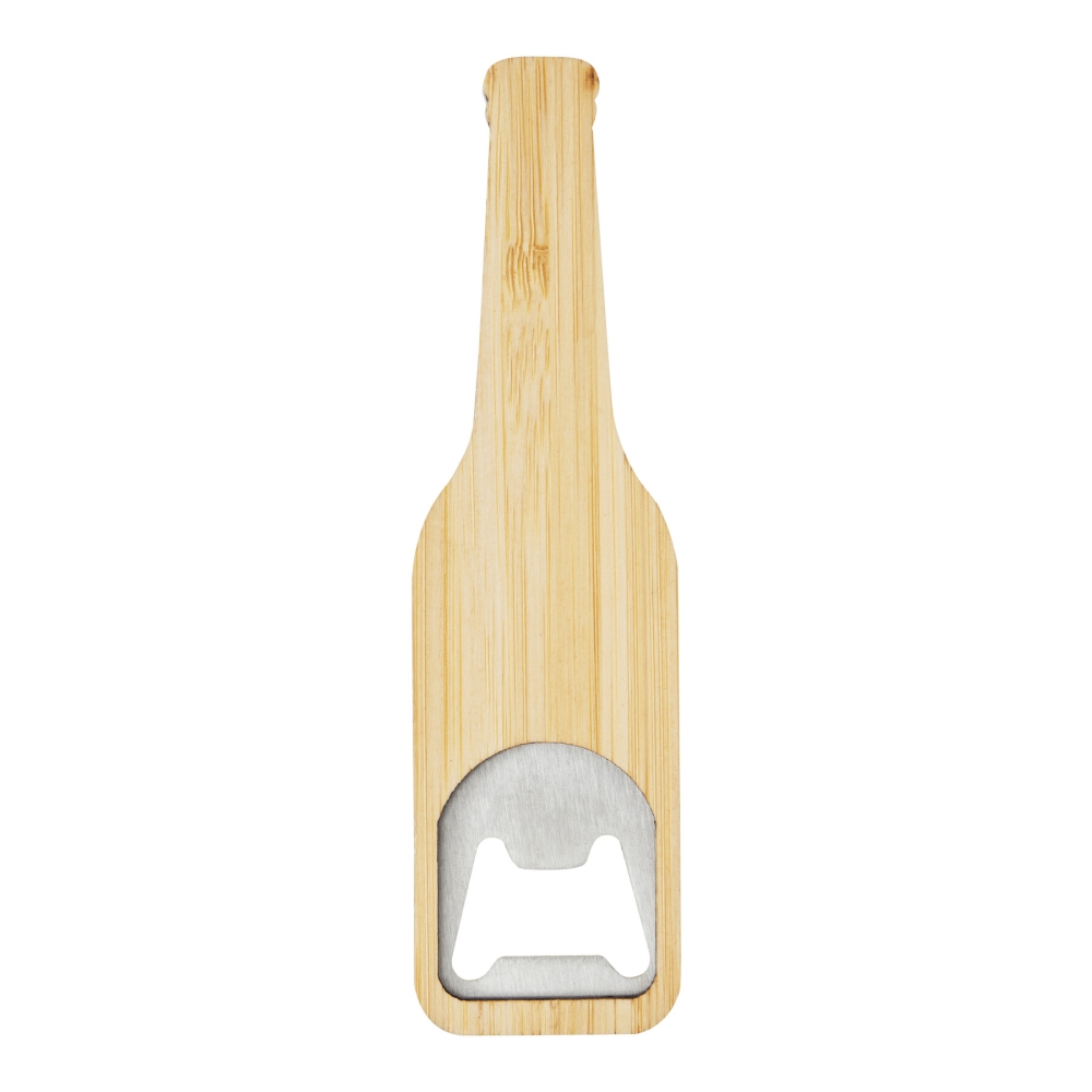 Bambusový otvírák na lahve, design ve tvaru lahve, zadní strana z nerezové oceli s magnetem. Rozměry: 12,6 x 3,5 x 0,5 cm