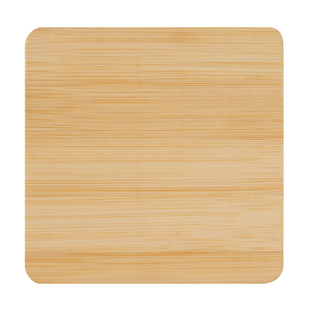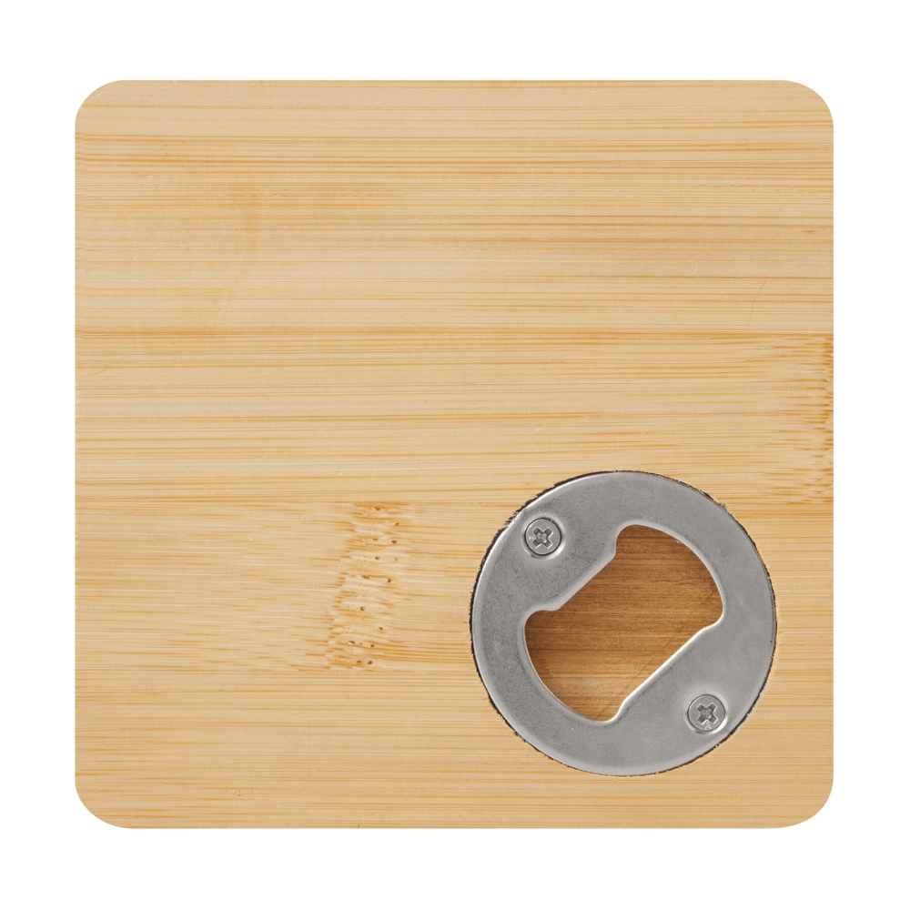 Bambusový podtácek, integrovaný otvírák na lahve, velká plocha pro potisk vašeho loga. Rozměry: 9,8 x 9,8 x 0,9 cm