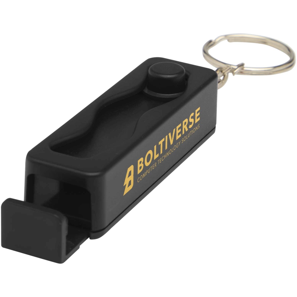 Zábavný a funkční doplněk vyrobený z recyklovaného plastu. Kombinuje vestavěný stojánek na telefon s fidget hračkou, která vám pomůže zůstat uvolnění a soustředění. Je kompaktní a snadno přenosný a dodává se také s klíčenkou pro každodenní pohodlí. Rozměry: 6,9 x 1,6 x 2 cm