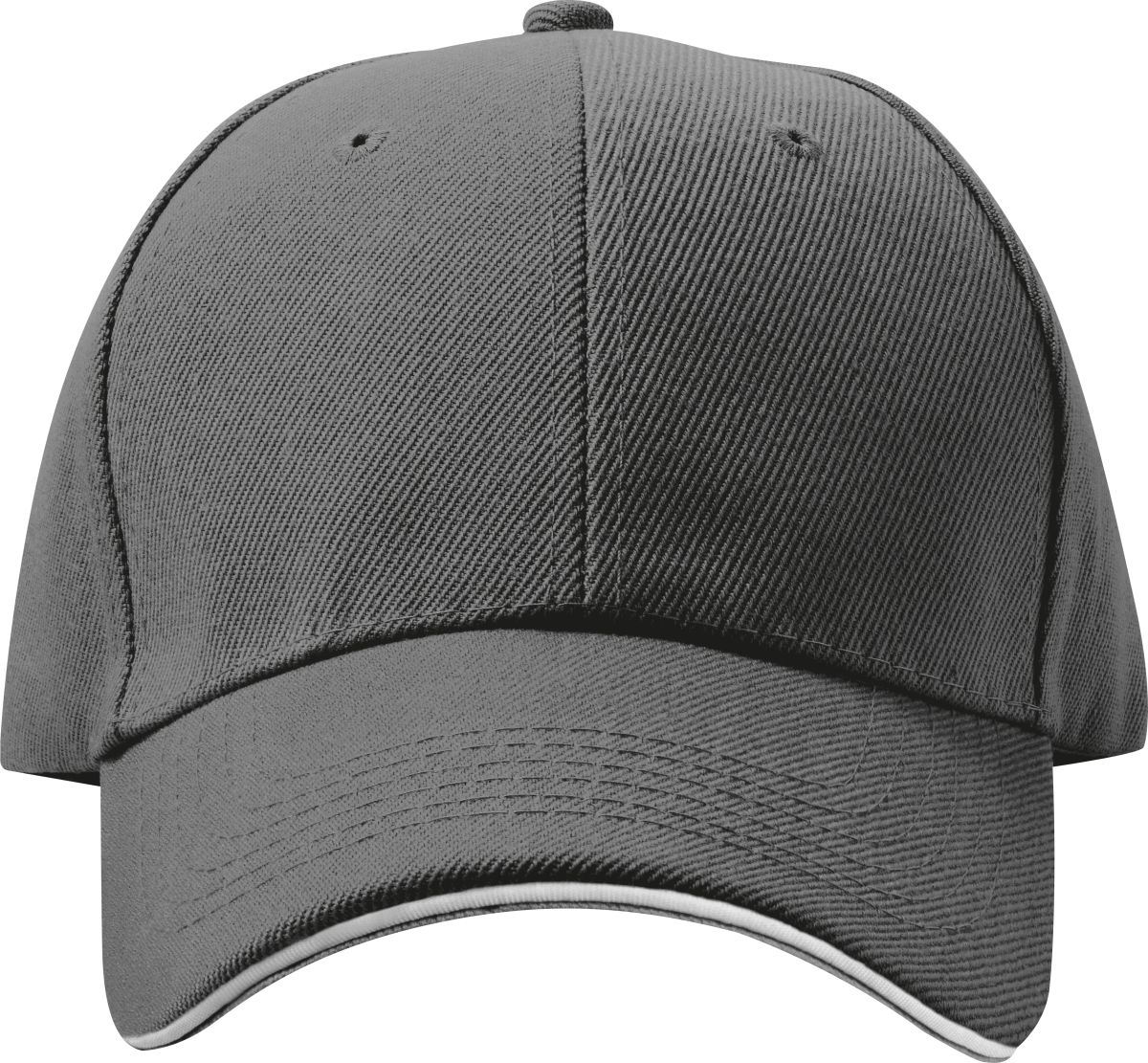 Šestipanelová baseballová čepice z česané bavlny s bílým proužkem na kšiltu a kovovým zapínáním, neobsahuje AZO prvky. Stříbrná barva.
