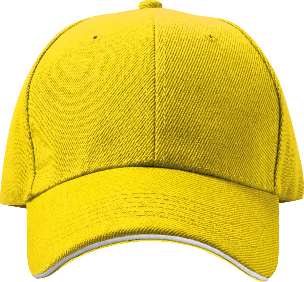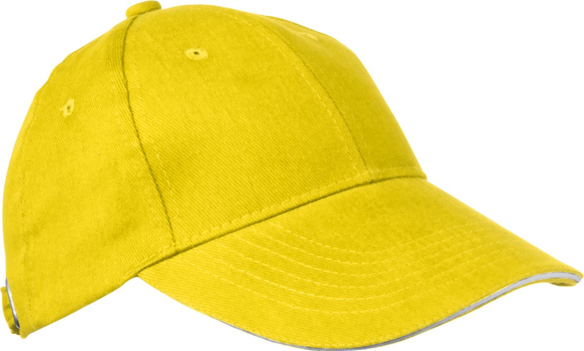 Šestipanelová baseballová čepice z česané bavlny s bílým proužkem na kšiltu a kovovým zapínáním, neobsahuje AZO prvky. Žlutá barva.