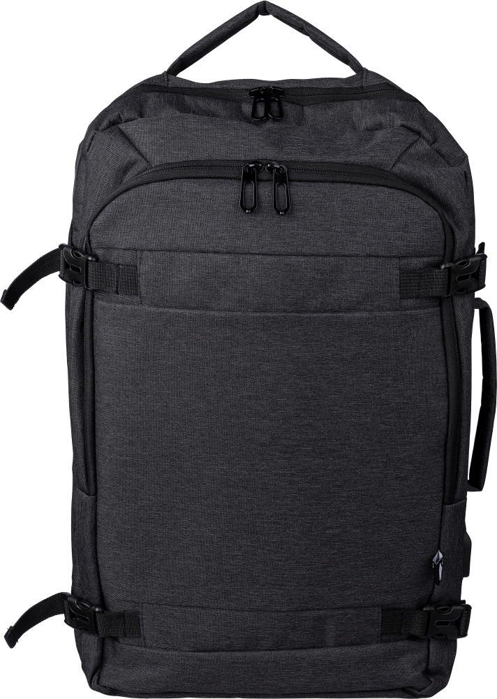 Batoh z 300D recyklovaného RPET polyesteru, který lze nosit také jako tašku na notebook (17“). Batoh má vnitřní podšívku z 210D polyesteru, poutko k uchopení nahoře (jako batoh) a na boku (jako taška na notebook) a popruh k připnutí na rukojeť cestovního kufru. Obsahuje kapsu na notebook uzavíratelnou na suchý zip, dvě velké kapsy uzavíratelné na zip, kapsu proti krádeži a USB-A port. Batoh má odvětrávanou a vypolstrovanou zádovou část. Rozměry: 46 × 32 × 20 cm. Cena nezahrnuje recyklační poplatek..