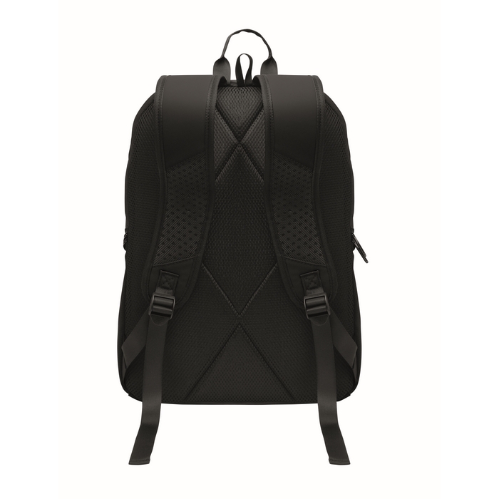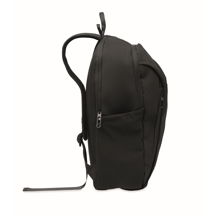 Batoh na 15palcový notebook z měkkého PU s polstrovanými zády a skrytým hlavním prostorem na zip. Jedna přední kapsa na zip, dve přední boční kapsy na zip a 2 boční kapsy z elastické síťoviny. S podšívkou z 210D RPET.Rozměry: 43,5 x 15 x 30cm