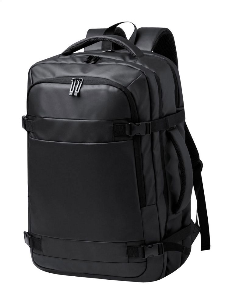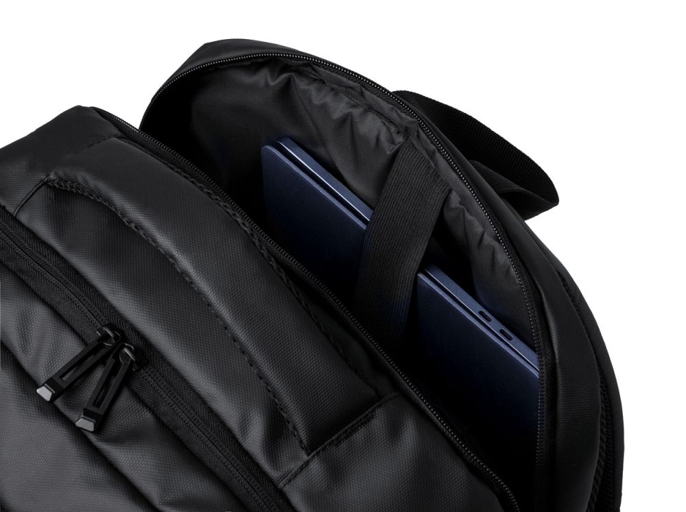 Dvoufunkční batoh a taška na dokumenty z PU kůže s přihrádkami na zip, polstrovanou přihrádkou na notebook (17") a síťovanou přihrádkou, popruhem na vozík, polstrovanými zády a ramenními popruhy. Rozměry: 33 x 48 x 16 cm.