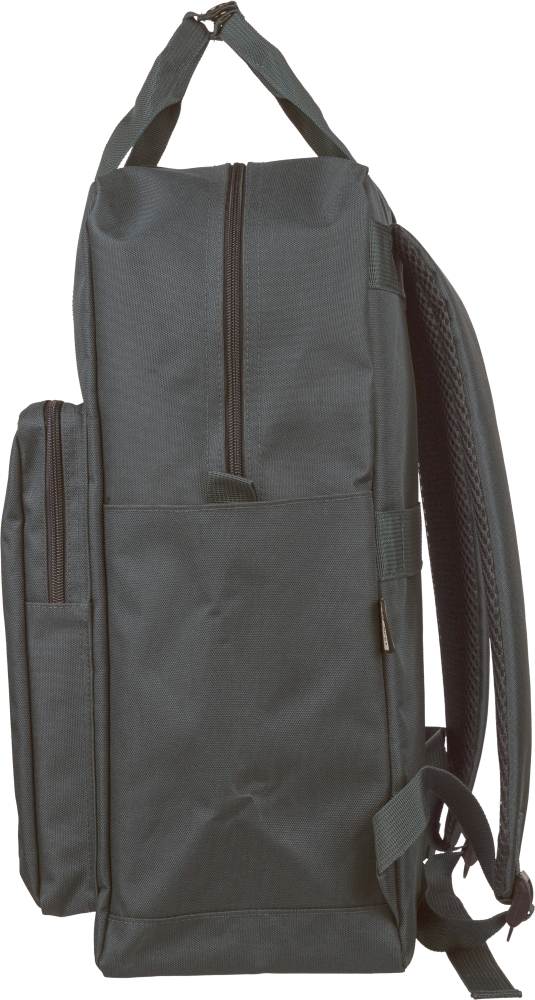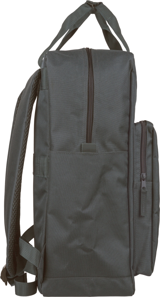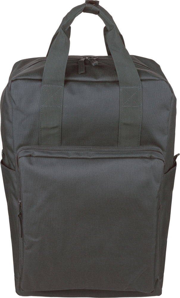 Batoh z recyklovaného polyesteru 900D s podšívkou 210D a štítkem rPET. Obsahuje velkou hlavní přihrádku s kapsou na 16" notebook, přední přihrádku, dvě boční kapsy, popruh na kolečkách, horní rukojeti s knoflíkem a odvětrávané ramenní popruhy. Rozměry: 16 cm x 45,5 cm