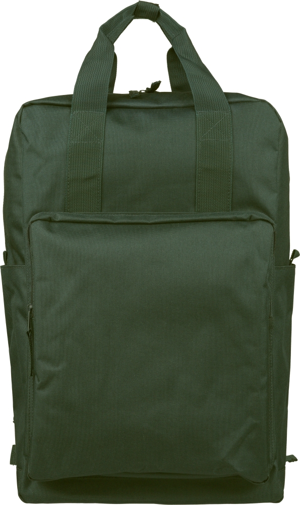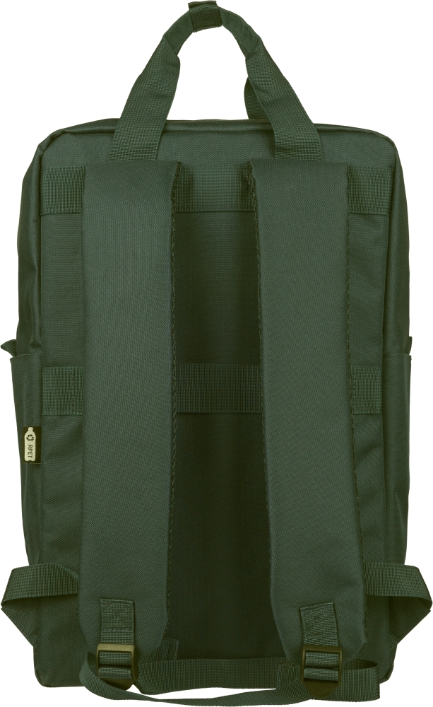 Batoh z recyklovaného polyesteru 900D s podšívkou 210D a štítkem rPET. Obsahuje velkou hlavní přihrádku s kapsou na 16" notebook, přední přihrádku, dvě boční kapsy, popruh na kolečkách, horní rukojeti s knoflíkem a odvětrávané ramenní popruhy. Rozměry: 16 cm x 45,5 cm