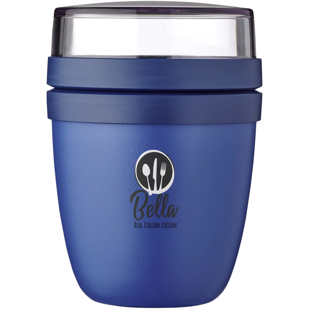Ideální box na jídlo na různé svačiny, jako je jogurt s müsli nebo polévka s krutony. Díky dvěma praktickým přihrádkám v jedné pevné nádobě zůstanou vaše ingredience pěkně oddělené. Díky kompaktním rozměrům se snadno vejde do školní tašky a lze ho použít na rychlý a praktický oběd. Horní průhledná nádoba pojme 120 ml, což je ideální na přibližně 50 gramů müsli nebo ovoce, a spodní nádoba má objem 300 ml. Dobře těsní a je vhodná do myčky na nádobí. Neobsahuje BPA. Rozměry: 12,8 x O 9,1 cm