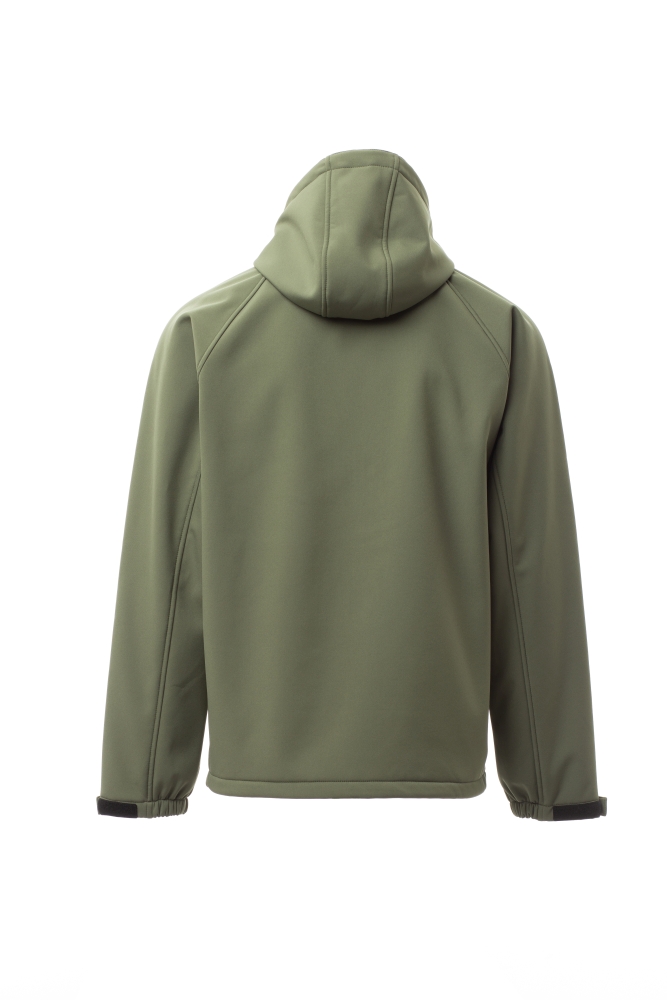 Pánská softshellová bunda, nepromokavá, větruvzdorná, raglánové rukávy, kapuce se šňůrkami ke stažení, dvě vnější kapsy na zip. Zapínání na zip, suchý zip u krku. Výška vodního sloupce 8 000 mm, prodyšnost 3 000 mvp. Materiál 100% polyester, shoft-shell, 320 g/m2.
