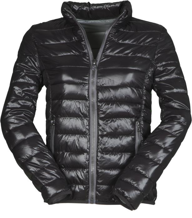 Dámská prošívaná bunda s šedou podšívkou, zapínání na zip, 2 vnitřní a 2 vnější kapsy, 100% nylon s lesklým efektem, uvnitř polyester - imitace peří. Kovové zipy s pogumovaným povrchem. Doporučená technologie tisku: sítotisk S3, výšivka.