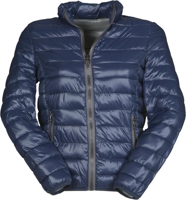 Dámská prošívaná bunda s šedou podšívkou, zapínání na zip, 2 vnitřní a 2 vnější kapsy, 100% nylon s lesklým efektem, uvnitř polyester - imitace peří. Kovové zipy s pogumovaným povrchem. Doporučená technologie tisku: sítotisk S3, výšivka.