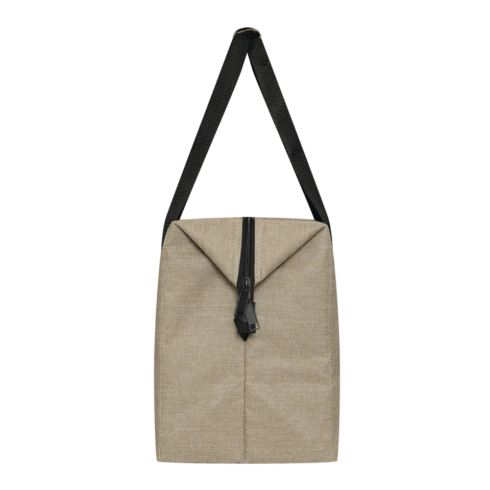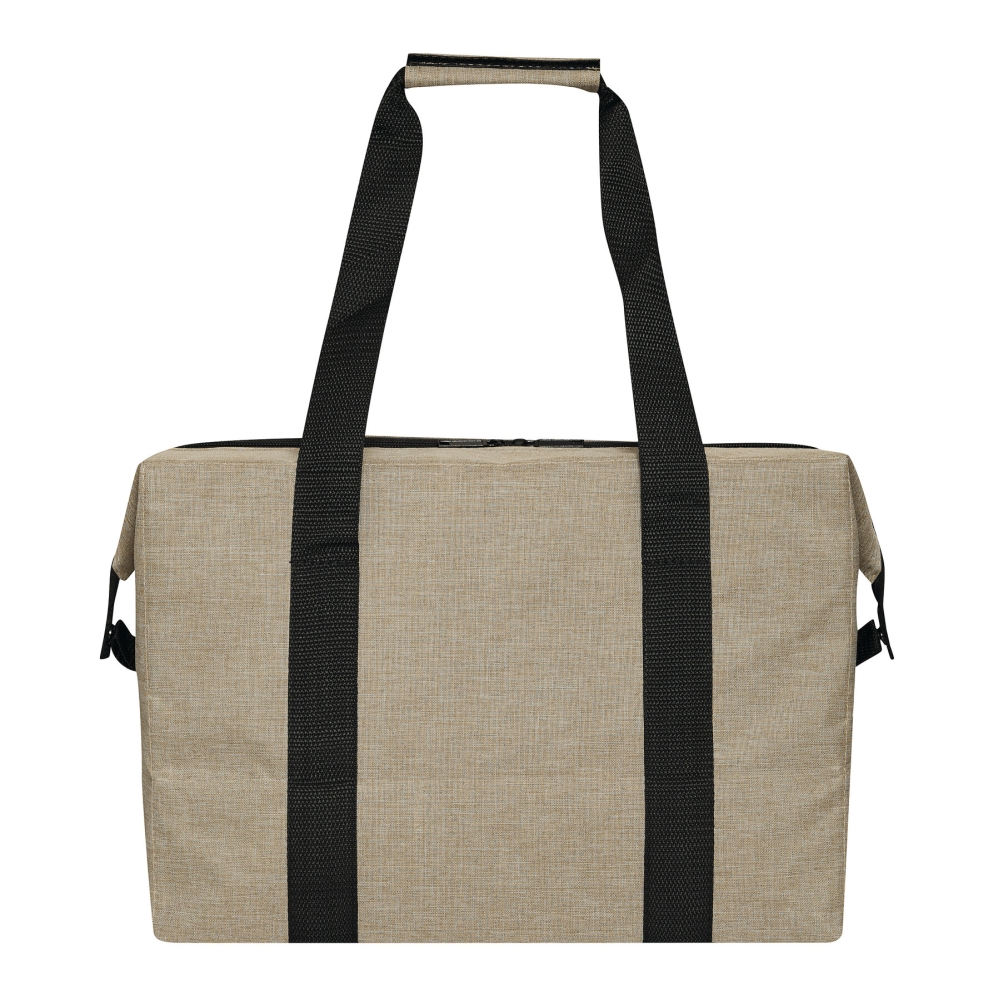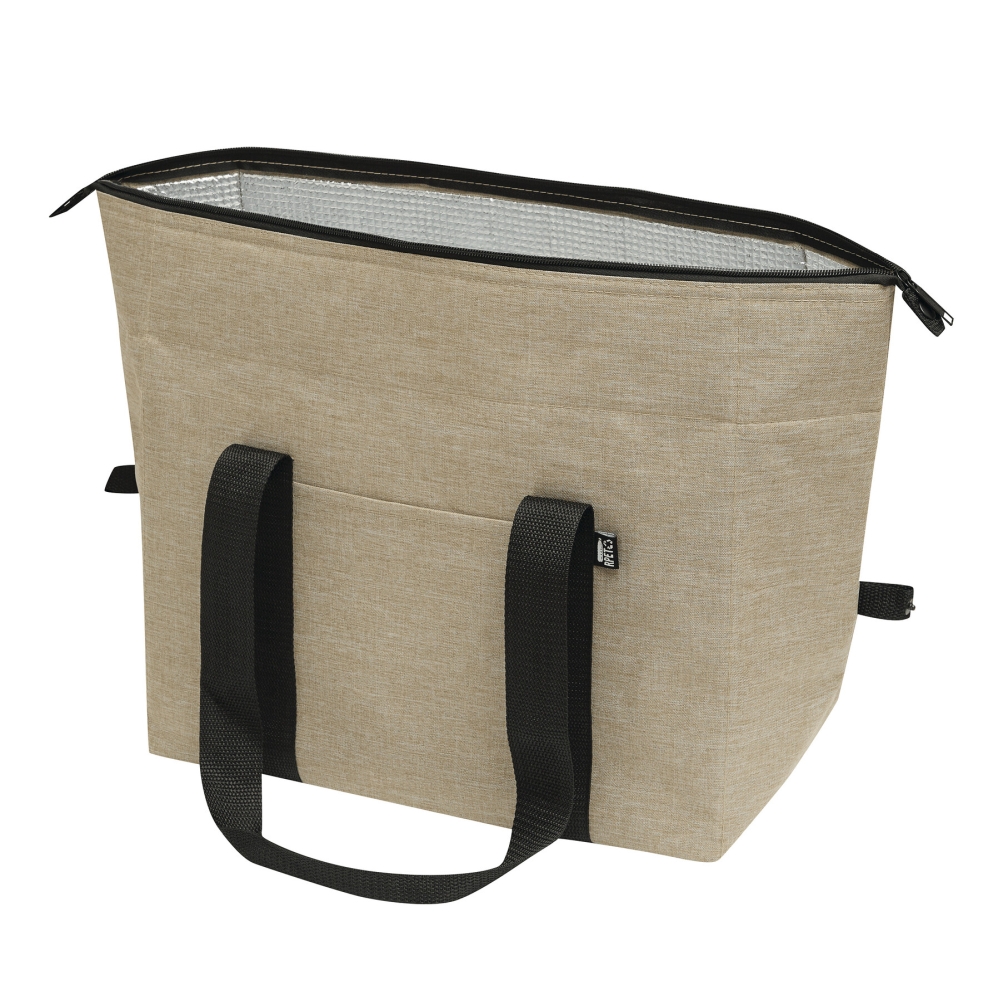Chladicí taška, vyrobena z recyklovaného plastu (RPET), zateplená hlavní přihrádka s oboucestným zipem, 1 zasouvací kapsa na přední straně, zesílené rukojeti, úložný prostor lze rozšířit odepnutím horních okrajů tašky z popruhu připevněného na každé straně. Rozměry: 60 x 19 x 44 cm