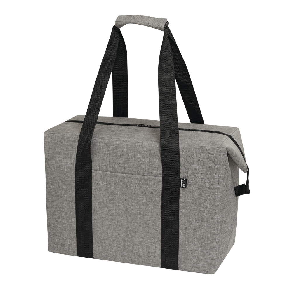Chladicí taška, vyrobena z recyklovaného plastu (RPET), zateplená hlavní přihrádka s oboucestným zipem, 1 zasouvací kapsa na přední straně, zesílené rukojeti, úložný prostor lze rozšířit odepnutím horních okrajů tašky z popruhu připevněného na každé straně. Rozměry: 56 x 19 x 44 cm