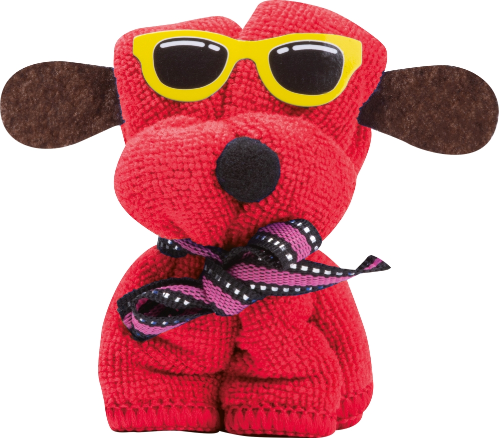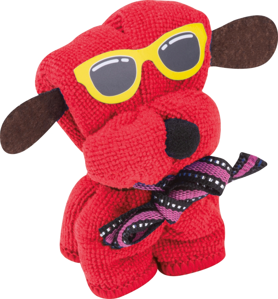 Měkký hadřík z mikrovlákna (20 x 20 cm) složený do tvaru psa a zabalená. Rozměry: 6 x 5,5 x 8 cm