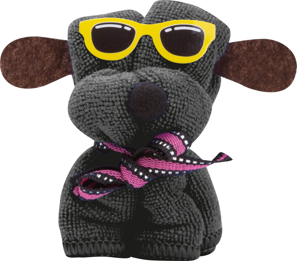 Měkký hadřík z mikrovlákna (20 x 20 cm) složený do tvaru psa a zabalená. Rozměry: 6 x 5,5 x 8 cm