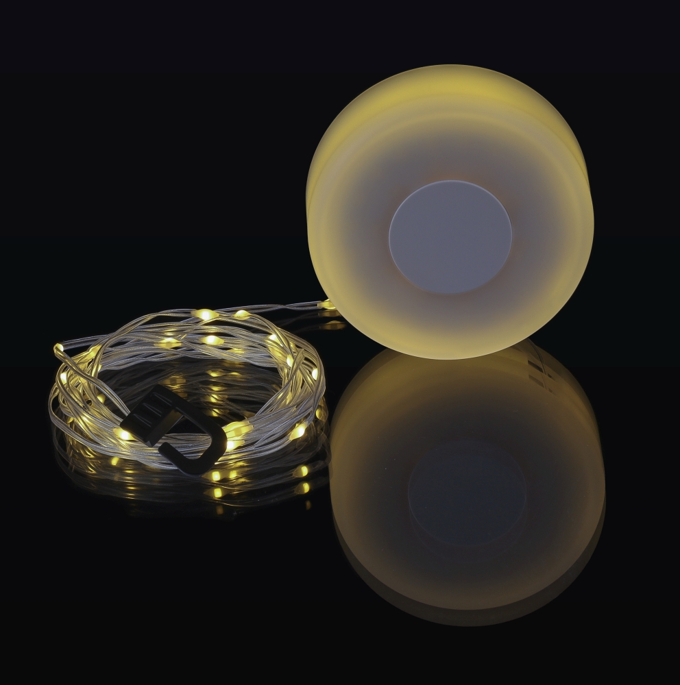 Světlo z ABS plastu s dobíjecí kempingovou lampou se dvěma světelnými funkcemi. Součástí je 8metrový světelný řetězec, který lze navíjet pomocí cívky. Napájeno baterií s kapacitou 1 000 mAh s nabíjením přes konektor typu C. Jednotlivě baleno v hnědé kartonové krabici. Výška: 4,8 cm