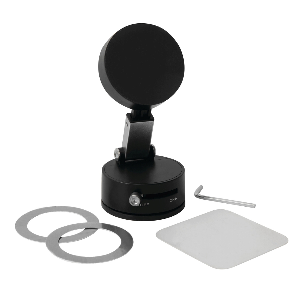 Držák na smartphone, silné a bezpečné uchycení na palubní desce nebo čelním skle automobilu díky vakuové přísavce aktivované posuvným zámkem, nastavitelná otočná hlava s magnetickým protiskluzovým povrchem, další lepicí podložka pro drsné povrchy, jednorázový vlhčený ubrousek a čisticí hadřík, šestihranný klíč a 2 magnetické kroužky pro připevnění k smartphonu. Rozměry: O5,8 x 4,2 cm