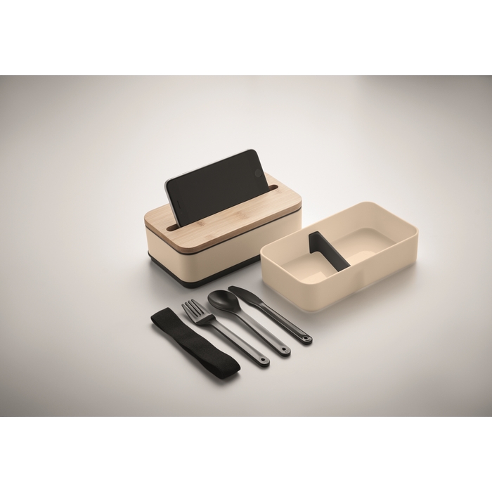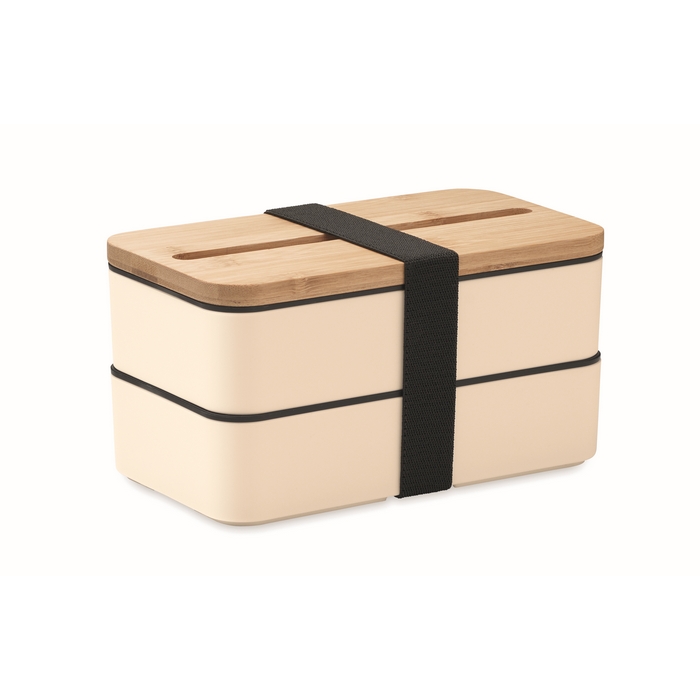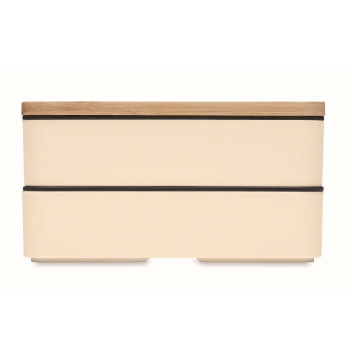 Dvoupatrový box na svačinu z PP s odnímatelnou přepážkou a 3 příbory. Zavírání pomocí pásky. Bambusové víko slouží i jako stojánek na telefon. Objem: 400 ml (2x). Bambus je přírodní materiál, může dojít k mírným změnám barvy, dekorace a velikosti. Neteče. Rozměry: 18 x 10 x 9,5 cm