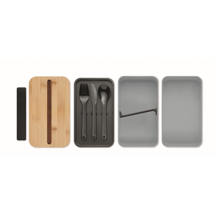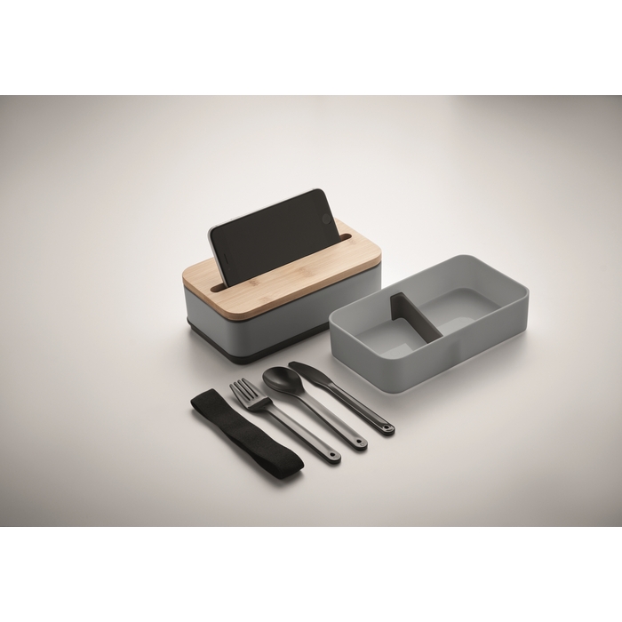 Dvoupatrový box na svačinu z PP s odnímatelnou přepážkou a 3 příbory. Zavírání pomocí pásky. Bambusové víko slouží i jako stojánek na telefon. Objem: 400 ml (2x). Bambus je přírodní materiál, může dojít k mírným změnám barvy, dekorace a velikosti. Neteče. Rozměry: 18 x 10 x 9,5 cm
