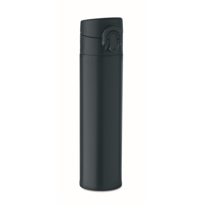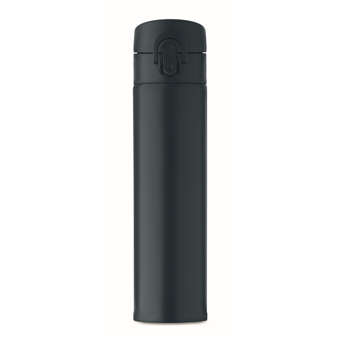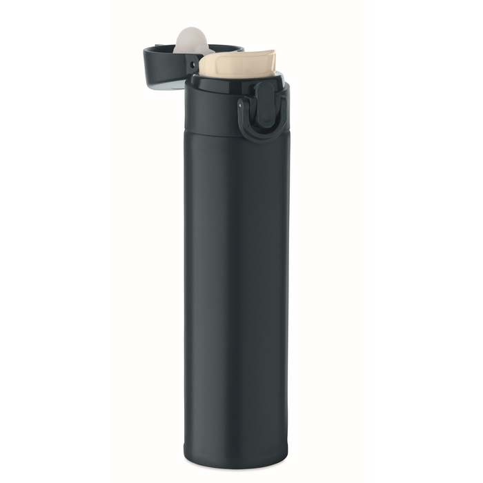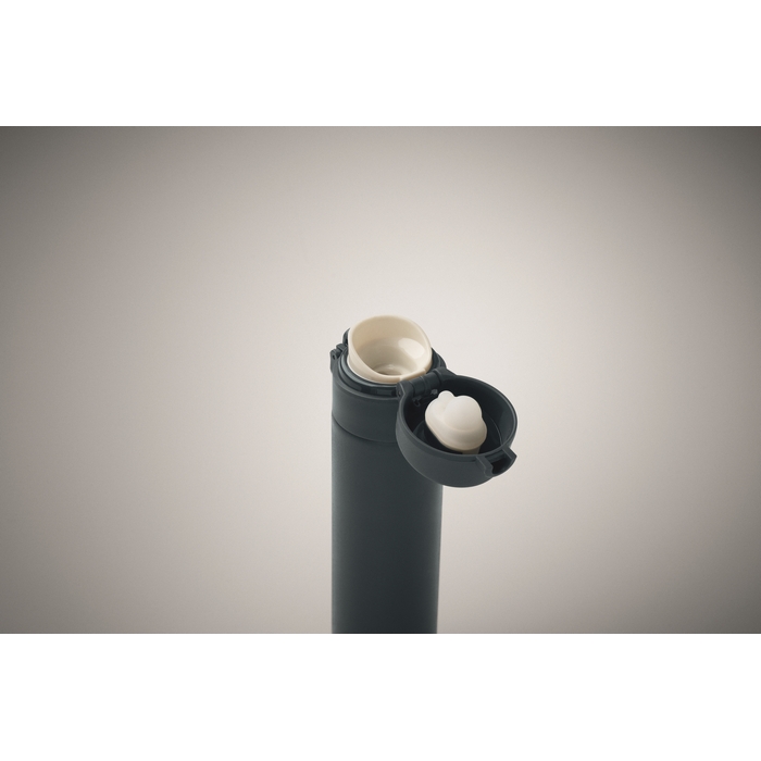 Dvoustěnná láhev na pití z recyklované nerezové oceli (90 % recyklované nerezové oceli a 10 % nerezové oceli) s bezpečnostním zámkem na víčku a možností otevírání stisknutím. Objem 300 ml.Rozměry: O5,8 x 22,7cm