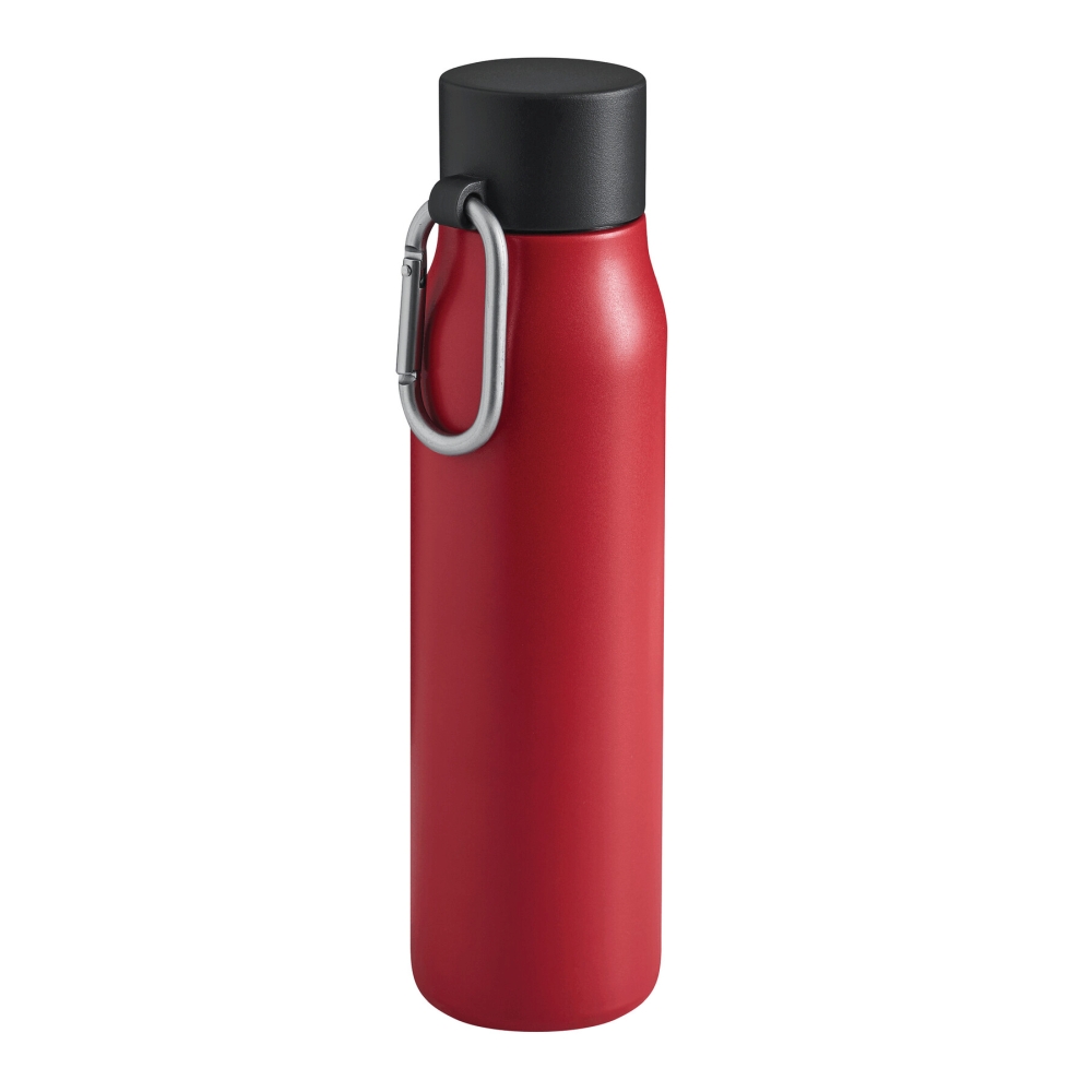 Dvoustěnná vakuová láhev na pití, vnitřek z recyklované nerezové oceli, vnější strana z nerezové oceli, plastové víčko s bezpečným šroubovacím uzávěrem, silikonovým těsněním a karabinou (karabina NENÍ vhodná pro lezení), objem cca 550 ml, udrží teplé nápoje cca 8 hodin a studenoé až 12 hodin, baleno v krabičce. Rozměry: O6,5 x 25 cm
