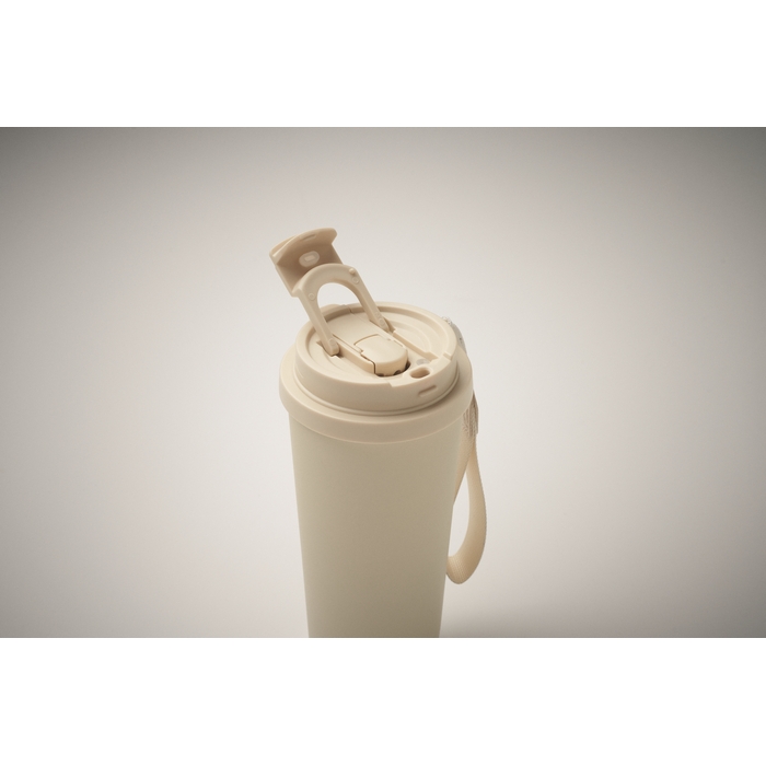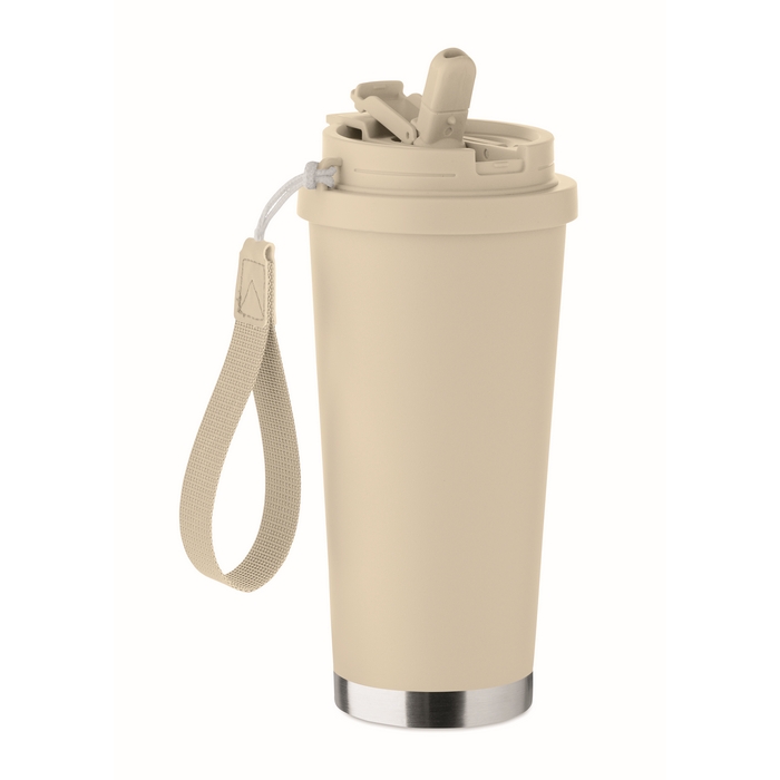 Dvoustěnný hrnek z recyklované nerezové oceli (90 % recyklované nerezové oceli a 10 % nerezové oceli) s víčkem z PP (víčko 2v1 s pítkem a brčkem) a s poutkem z RPET. Objem 500 ml.Rozměry: O9 x 19cm