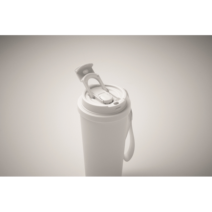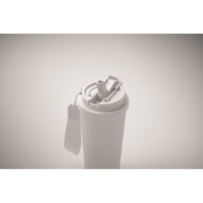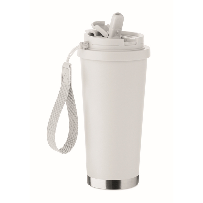Dvoustěnný hrnek z recyklované nerezové oceli (90 % recyklované nerezové oceli a 10 % nerezové oceli) s víčkem z PP (víčko 2v1 s pítkem a brčkem) a s poutkem z RPET. Objem 500 ml.Rozměry: O9 x 19cm