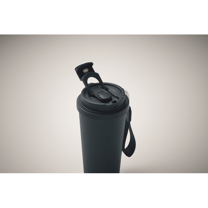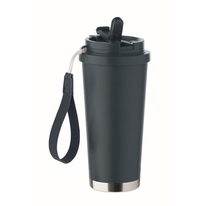 Dvoustěnný hrnek z recyklované nerezové oceli (90 % recyklované nerezové oceli a 10 % nerezové oceli) s víčkem z PP (víčko 2v1 s pítkem a brčkem) a s poutkem z RPET. Objem 500 ml.Rozměry: O9 x 19cm