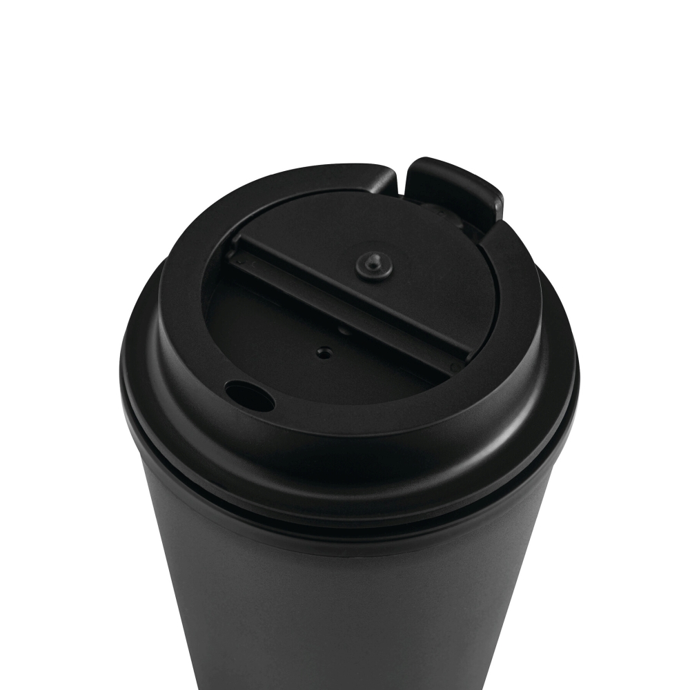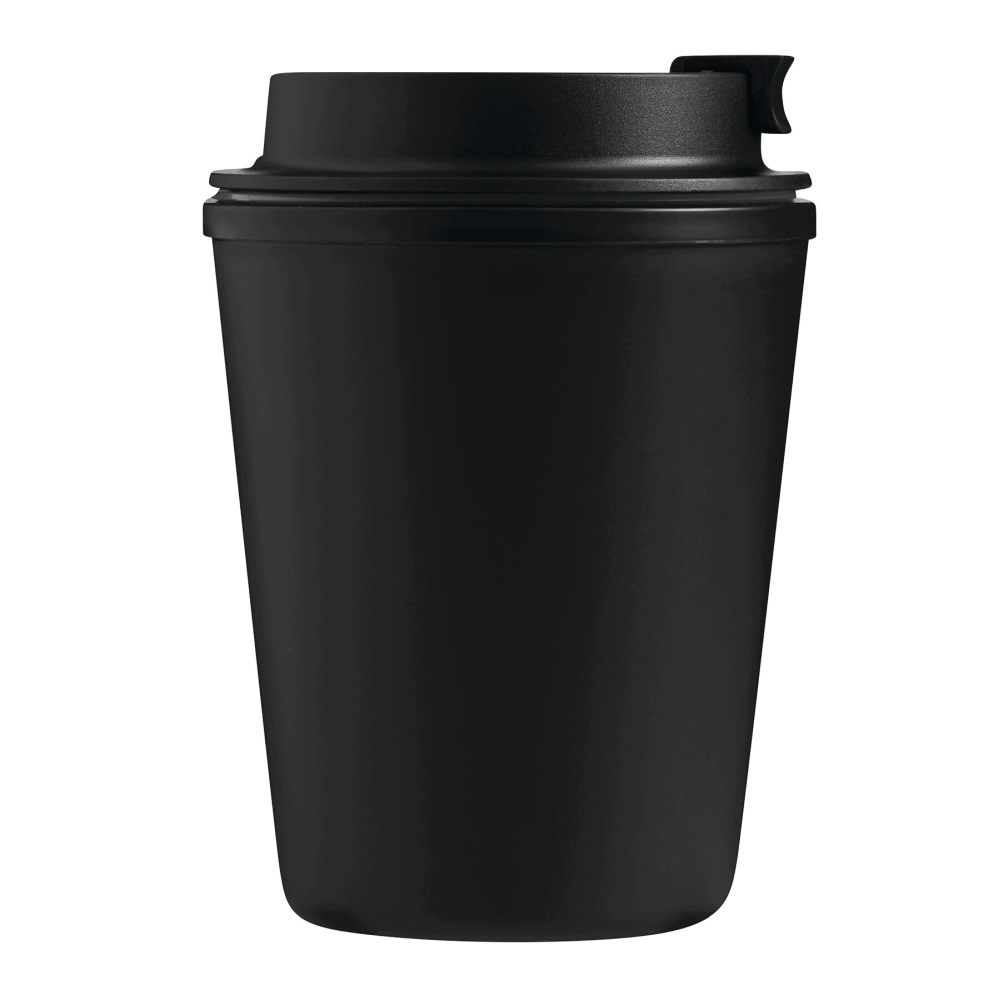 Dvoustěnný izolovaný hrnek, uvnitř i vně z plastu, bezpečný šroubovací uzávěr se silikonovým těsněním a integrovaným výklopným otvorem pro pití, objem cca 350 ml, udrží teplé nápoje cca 2 hodiny a studené až 4 hodiny. Rozměry: O9,2 x 13 cm