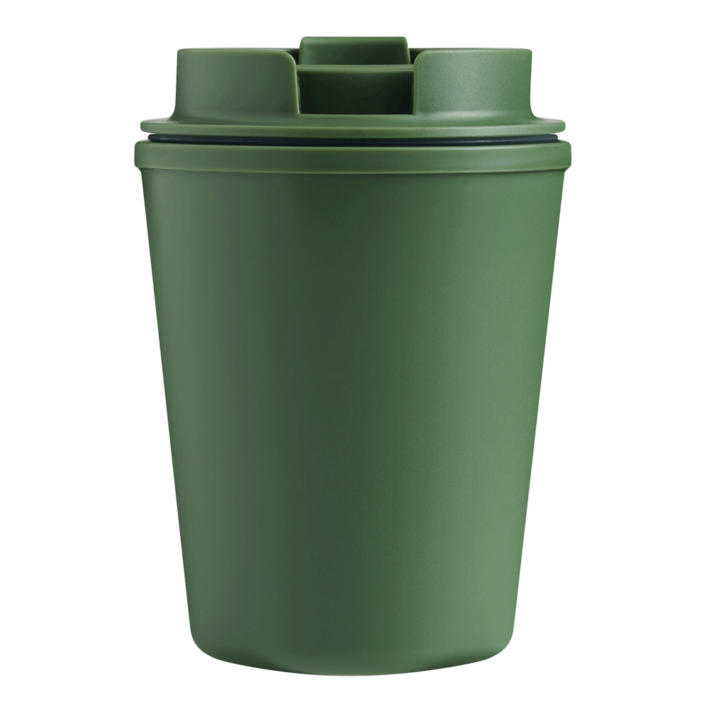 Dvoustěnný izolovaný hrnek, uvnitř i vně z plastu, bezpečný šroubovací uzávěr se silikonovým těsněním a integrovaným výklopným otvorem pro pití, objem cca 350 ml, udrží teplé nápoje cca 2 hodiny a studené až 4 hodiny. Rozměry: O9,2 x 13 cm