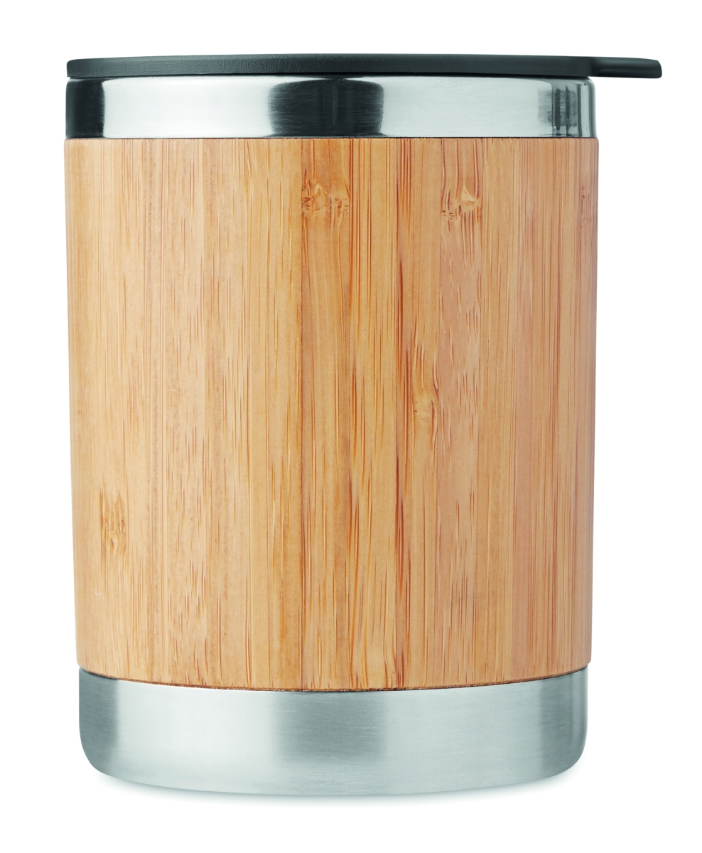 Dvoustěnný hrnek z nerezové oceli s bambusovým povrchem a víčkem se zavíráním. Objem 250 ml. Bambus je přírodní materiál, barevnost a povrch jednotlivých produktů se může lišit.Rozměr: O8X10CM.