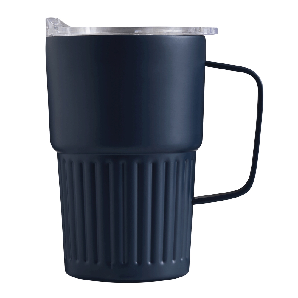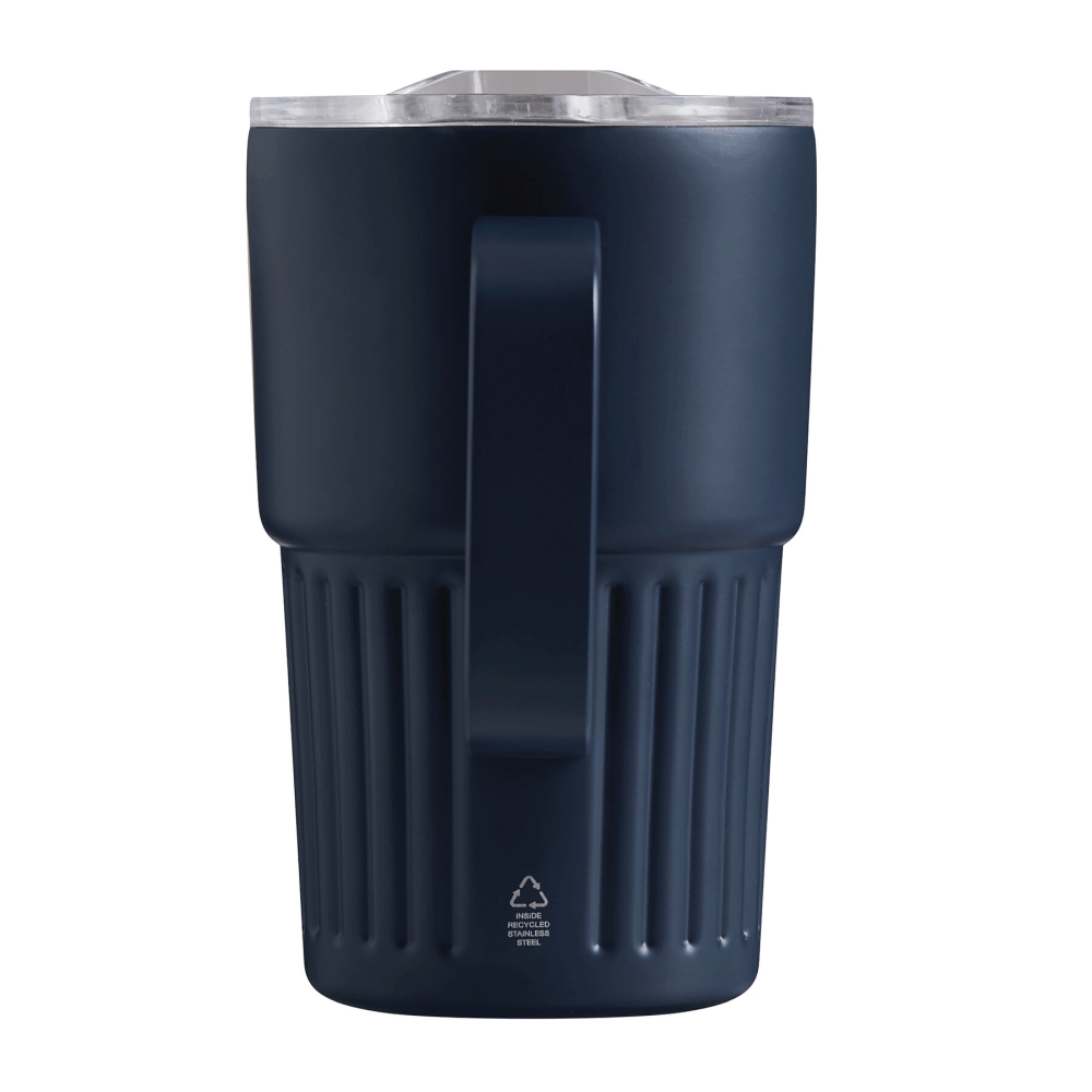 Dvoustěnný vakuový hrnek na nápoje, vnitřek z recyklované nerezové oceli, vnější strana z nerezové oceli, praktická rukojeť, plastové víko se silikonovým těsněním a integrovaným posuvným otvorem na pití, objem cca 450 ml, udrží teplé nápoje cca 4 hodiny a studené až 8 hodin, baleno v krabičce. Rozměry: O8,7 x 14 cm