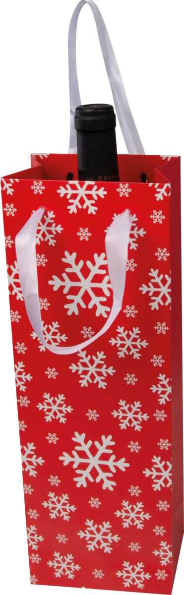 Vánoční papírová taška na vínos motivem sněhových vloček a stužkovými rukojeťmi. Rozměry: na víno 12 × 9 × 35 cm