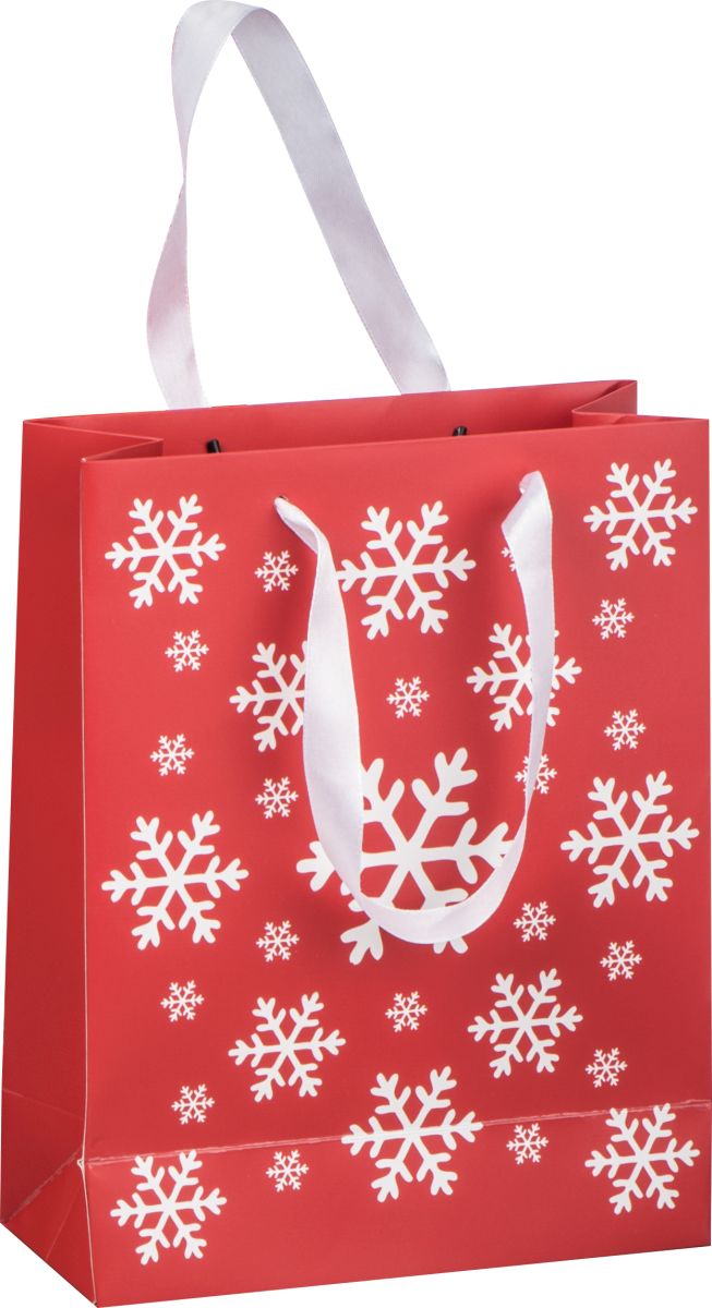 Vánoční papírová taška s motivem sněhových vloček a stužkovými rukojeťmi. Rozměry: na víno 12 × 9 × 35 cm, malá 18 × 8 × 23 cm, velká 25,9 × 12 × 32 cm.