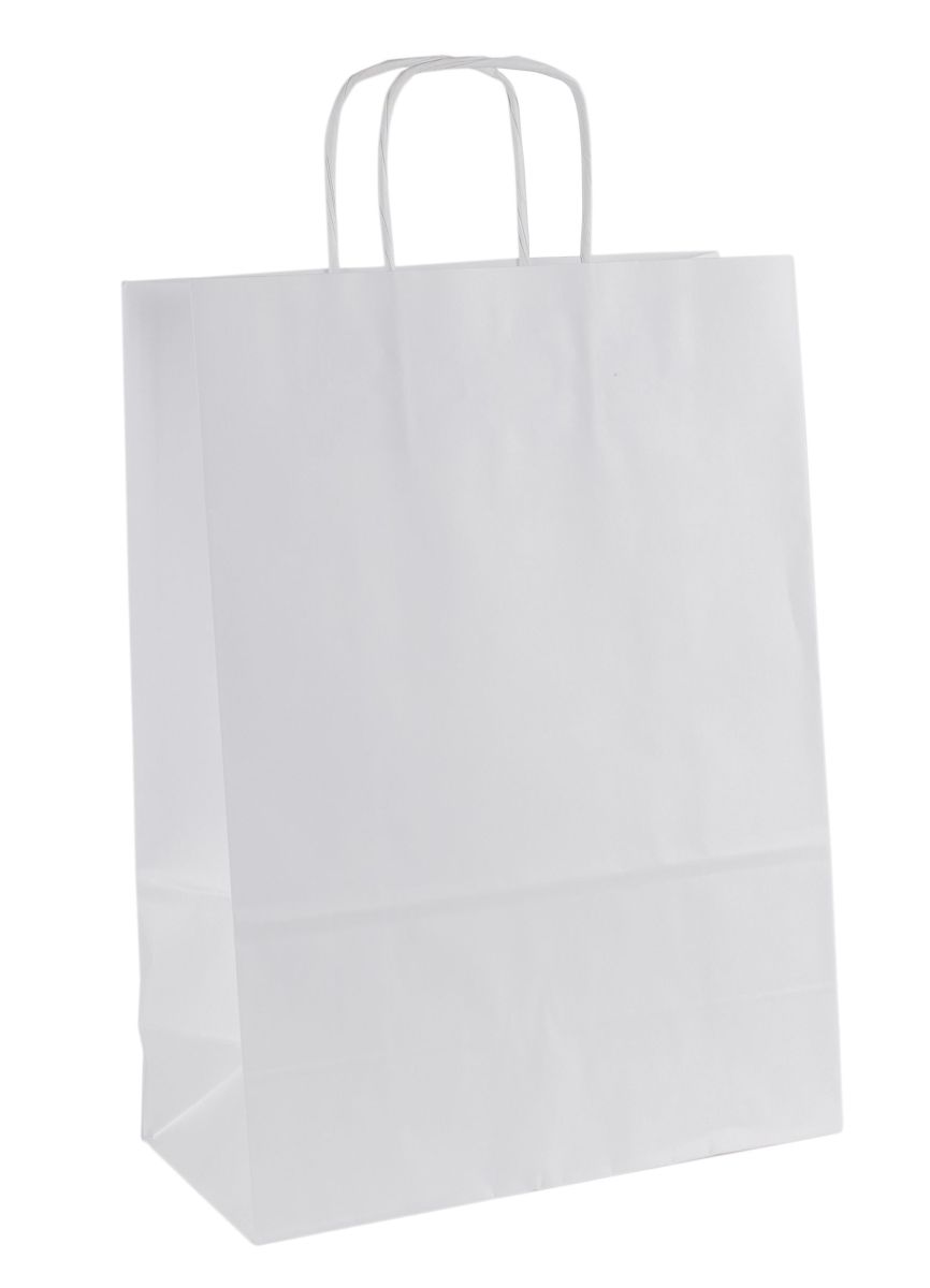 Papírová taška, bílý kraftový papír 100 g, bílé kroucené držadlo. Rozměry: 24 × 11 × 33 cm.
