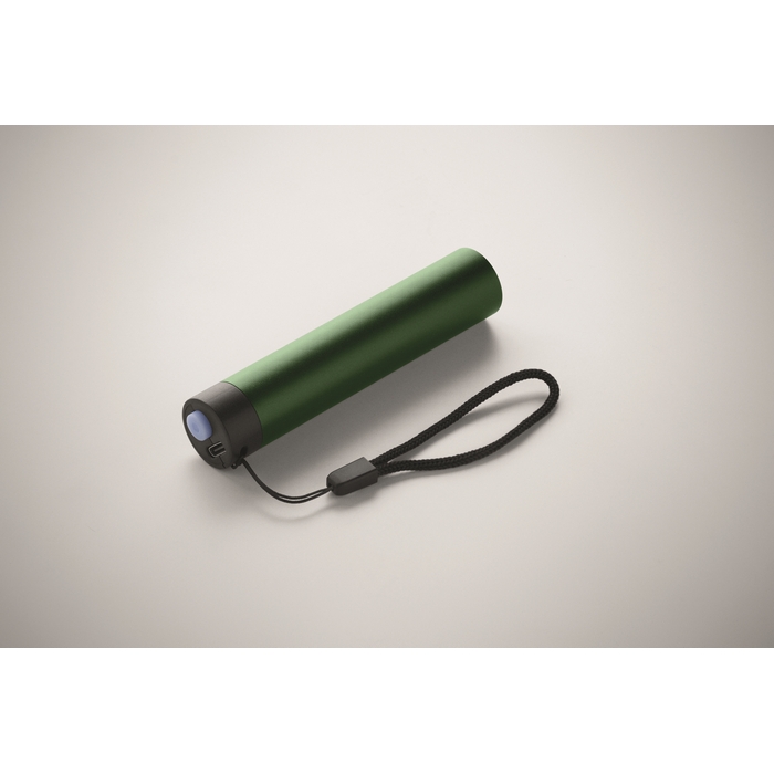 Dobíjecí svítilna z recyklovaného hliníku, 110 lumenů, se 3 nastaveními svícení. 1 vyměnitelná a dobíjecí 14500 lithiová baterie 400 mAh. Rozměry: 2.1 x 2.1 x 10 cm
