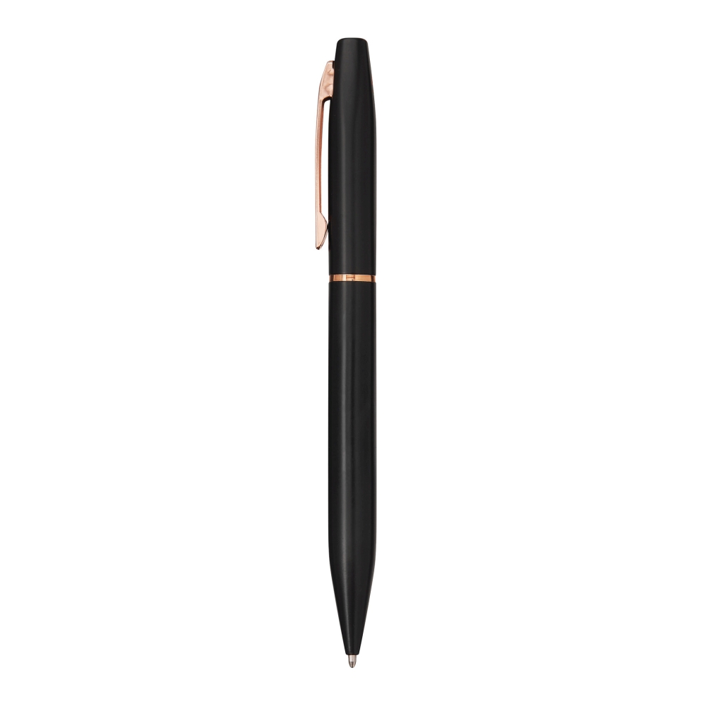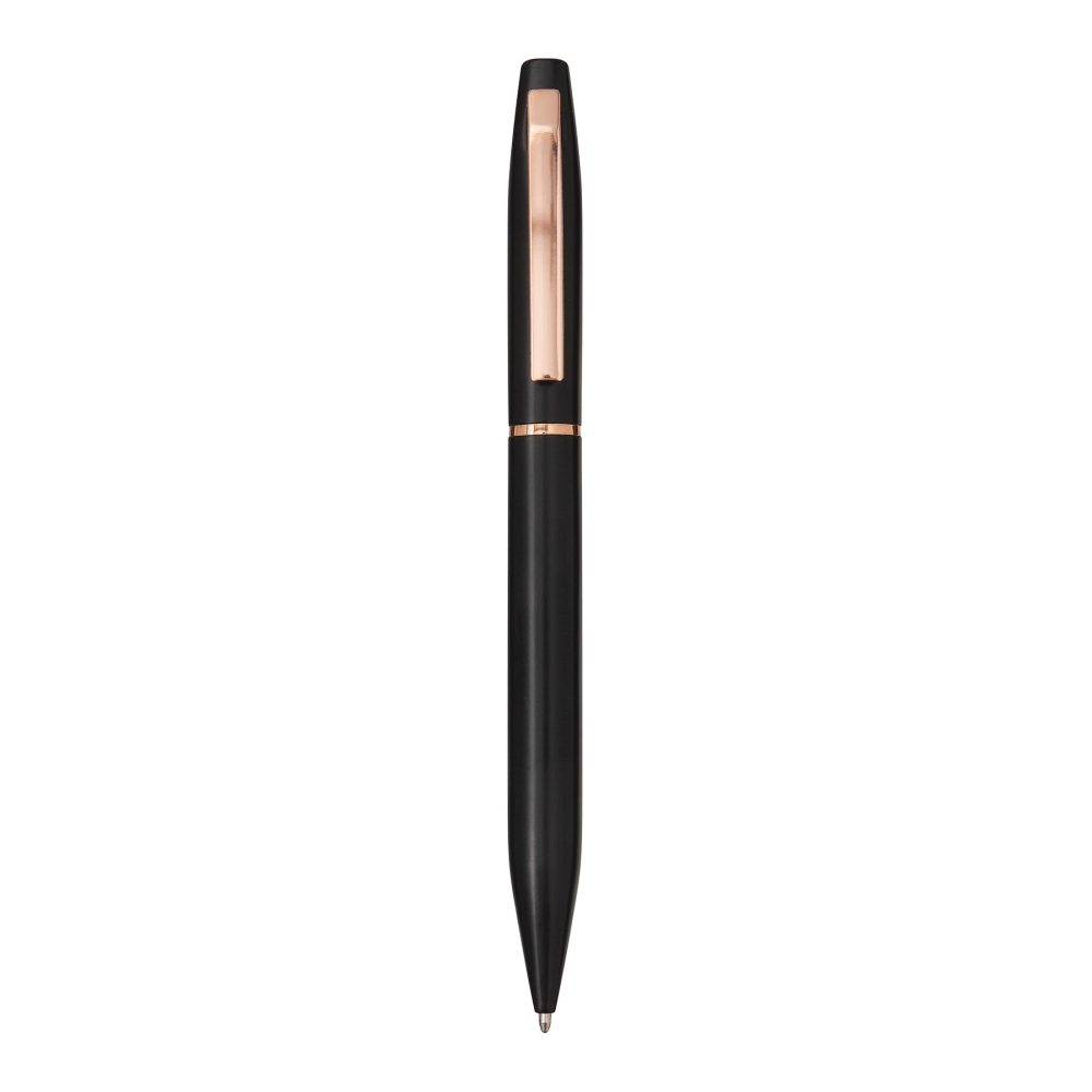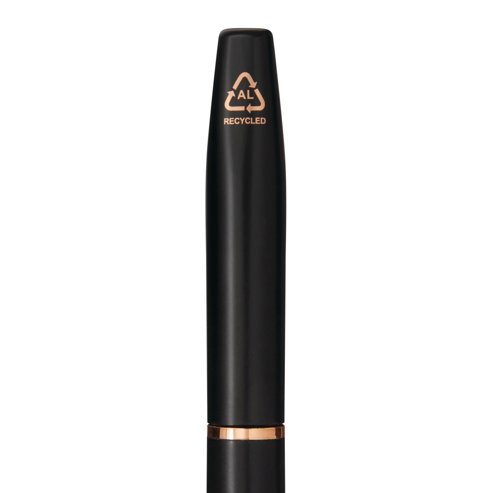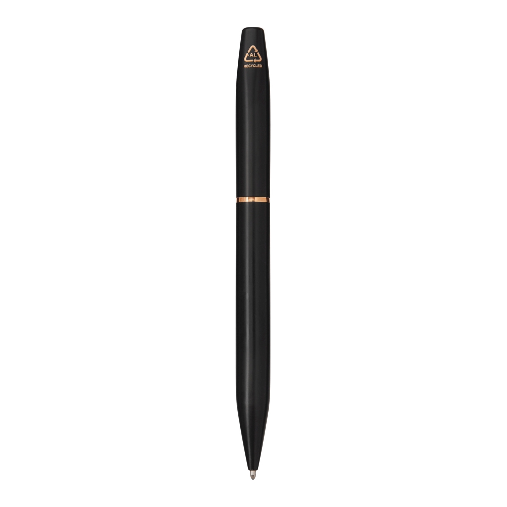 Hliníková propiska, matné kovové tělo, vyrobené z recyklovaného hliníku, s otočným mechanismem, stříbrný klip a kroužek, horní část pera s lesklou stříbrnou podkladovou vrstvou pro gravírování, kovová náplň, modrý inkoust, baleno v krabičce. Rozměry: 13,7 cm