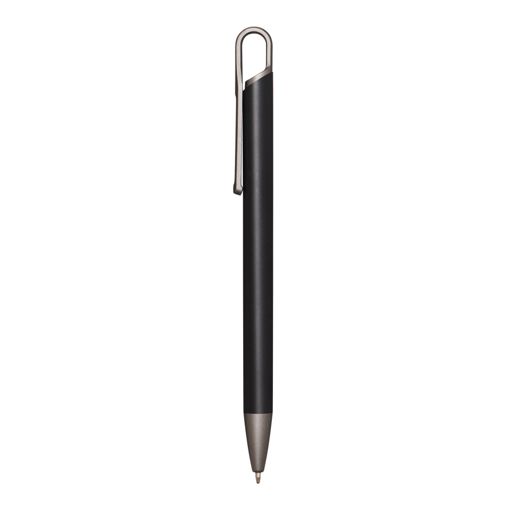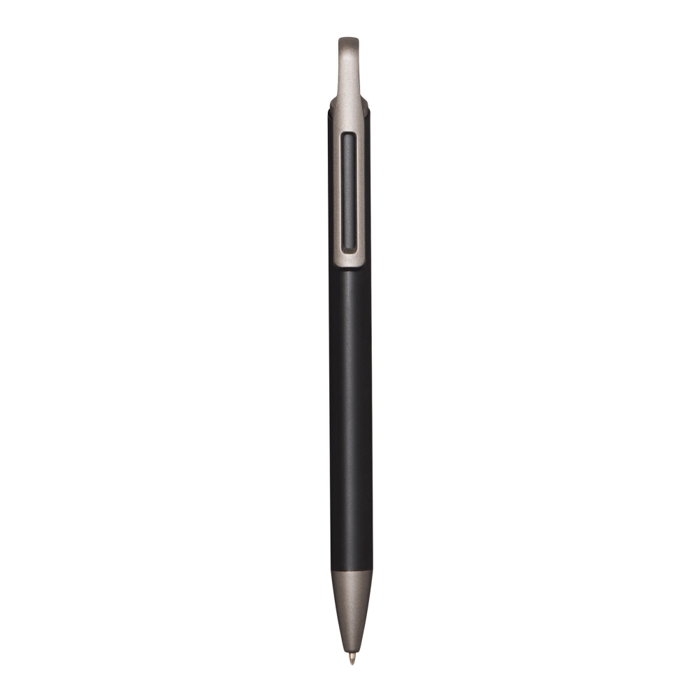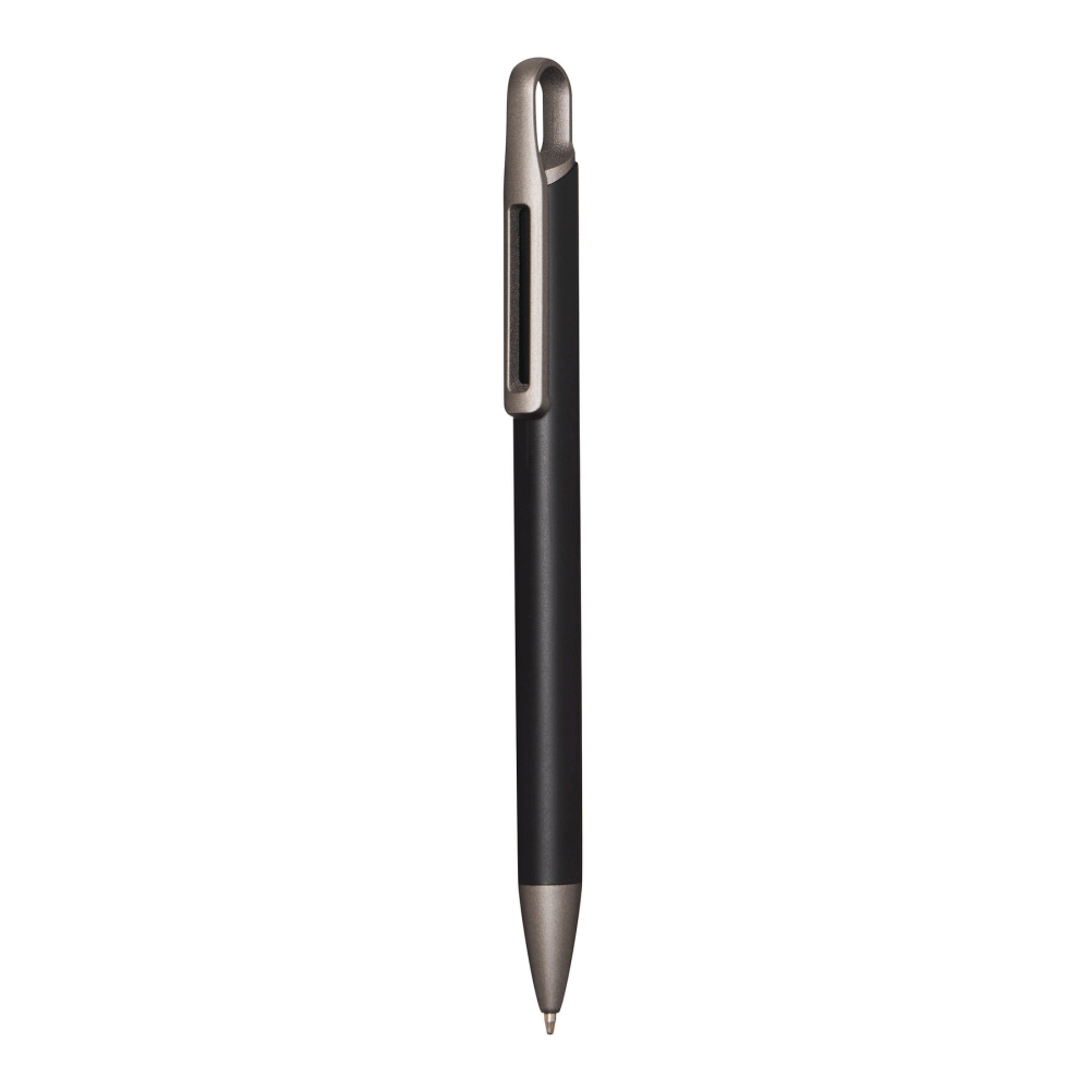 Propiska s matným hliníkovým tělem, tlačítkem, modrým inkoustem. Rozměry: 14 cm