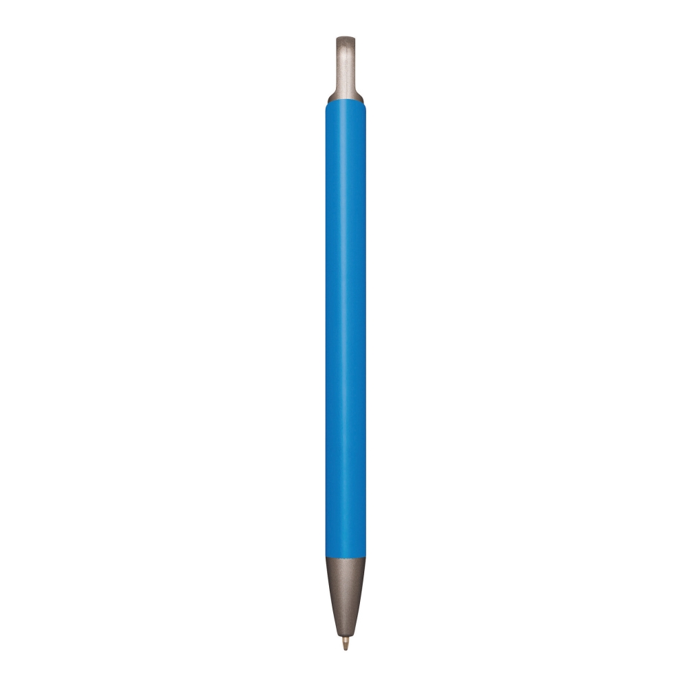 Propiska s matným hliníkovým tělem, tlačítkem, modrým inkoustem. Rozměry: 14 cm