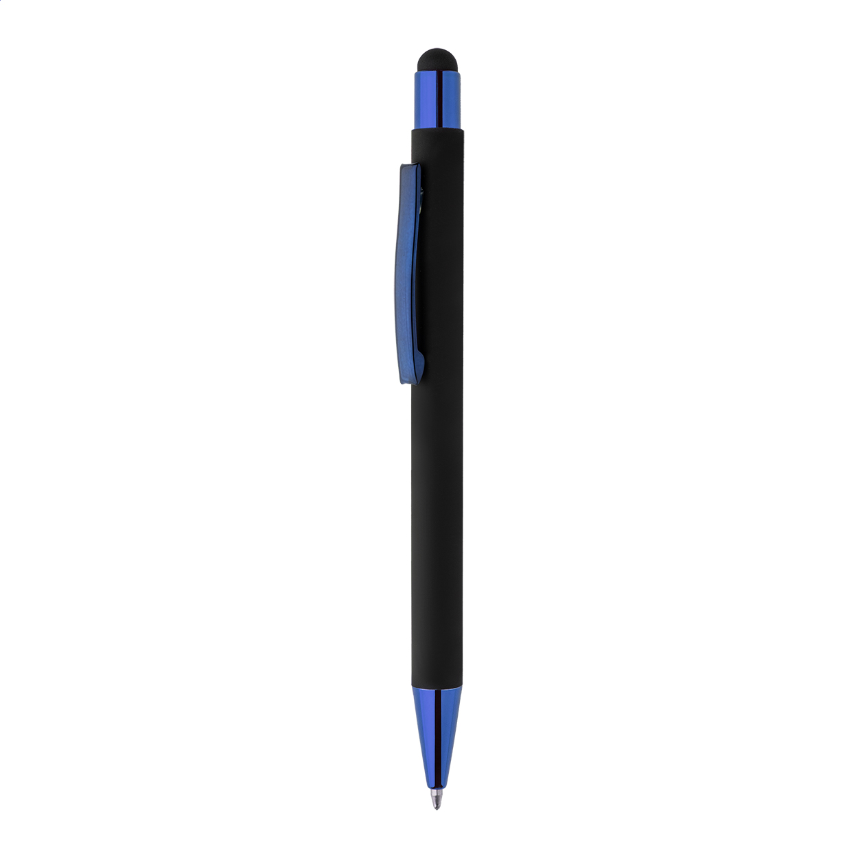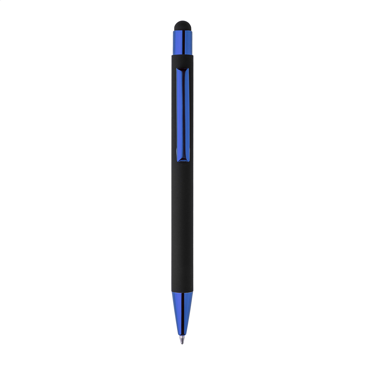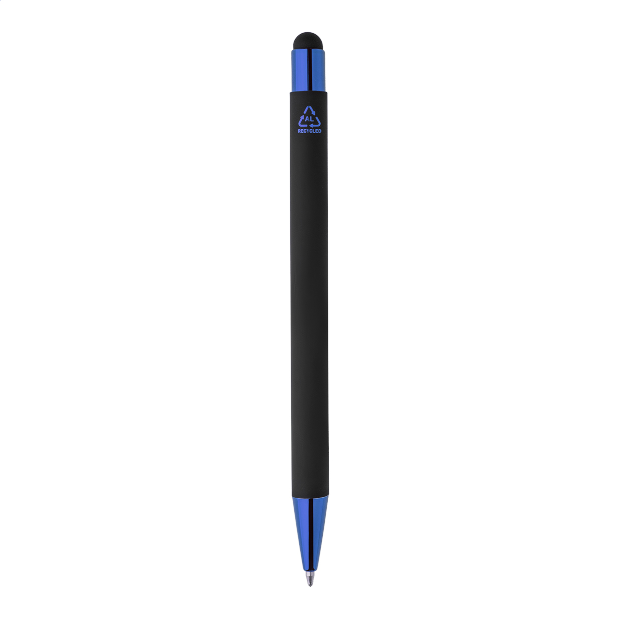 Propiska z recyklovaného hliníku na dotykovou obrazovku, s černým pogumovaným tělem a barevnými lesklými kovovými částmi. Se speciálním povrchem pro zrcadlové gravírování, které ladí s kovovými částmi. S modrou náplní.
