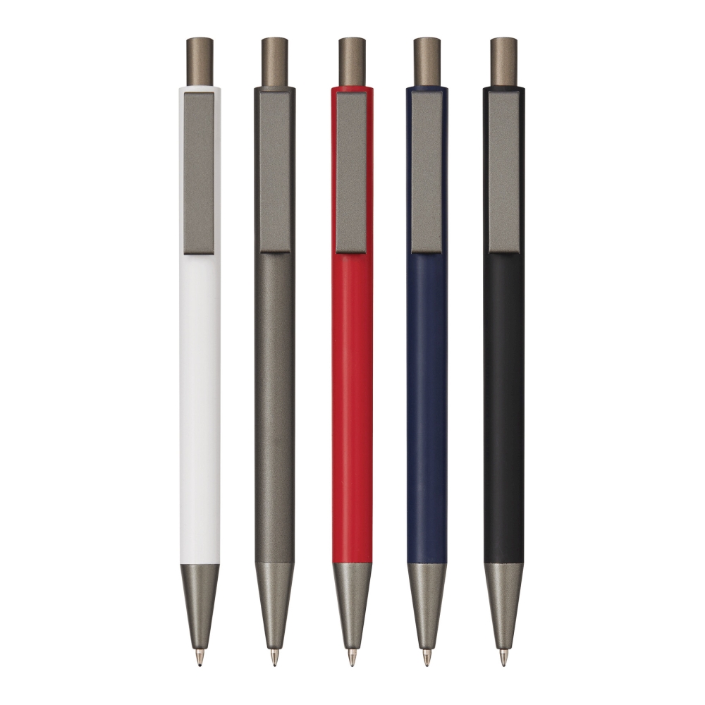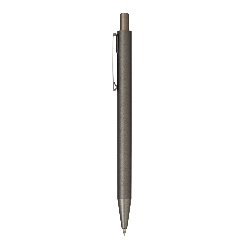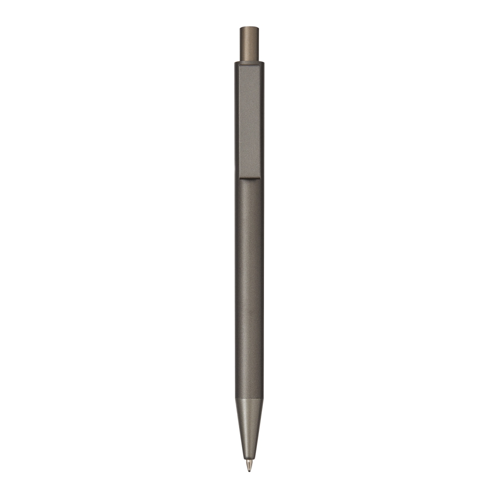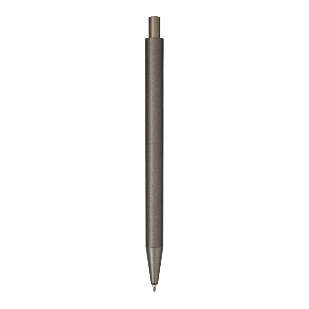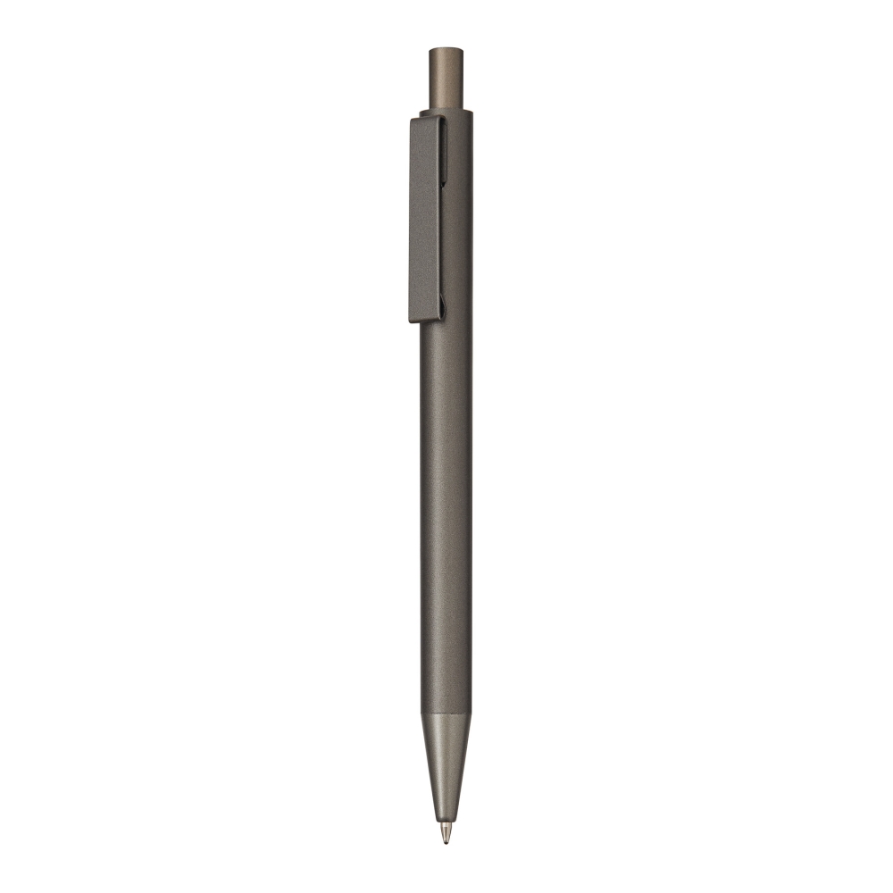 Hliníková propiska, matný kovový plášť, tlačítkový mechanismus, velká náplň, modrý inkoust. Rozměry: 14,2 cm