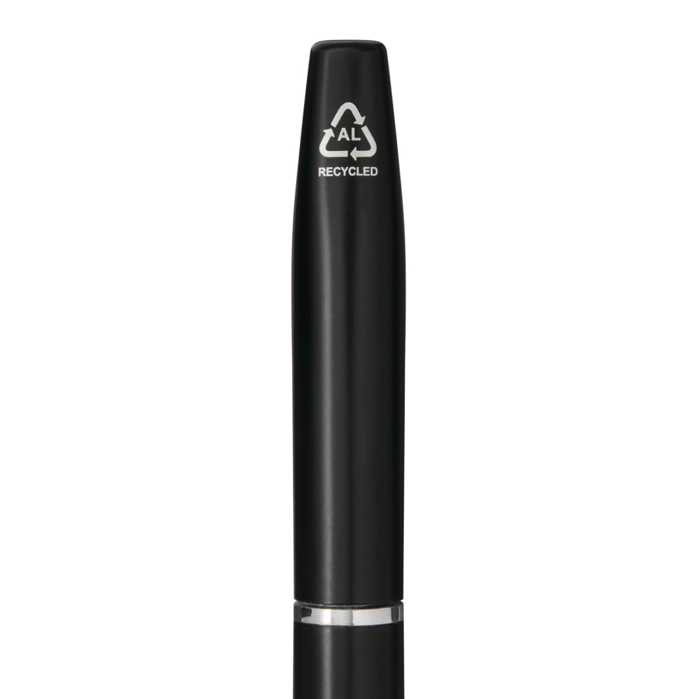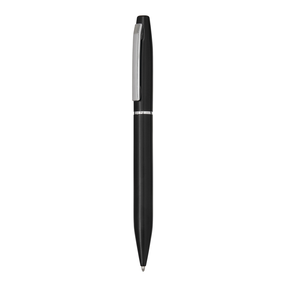 Hliníková propiska, matné kovové tělo, vyrobené z recyklovaného hliníku, s otočným mechanismem, stříbrný klip a kroužek, horní část pera s lesklou stříbrnou podkladovou vrstvou pro gravírování, kovová náplň, modrý inkoust, baleno v krabičce. Rozměry: 13,7 cm