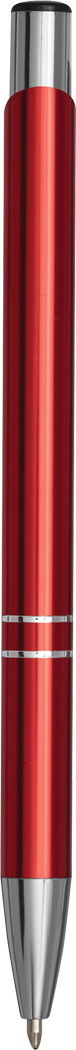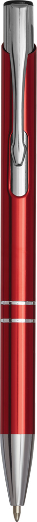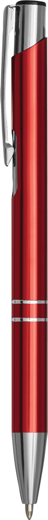 Hliníkové kuličkové pero má lesklé kovové tělo a klip, velkokapacitní náplň s modrým inkoustem, tlačítkový mechanismus. Rozměr: 13,7 cm